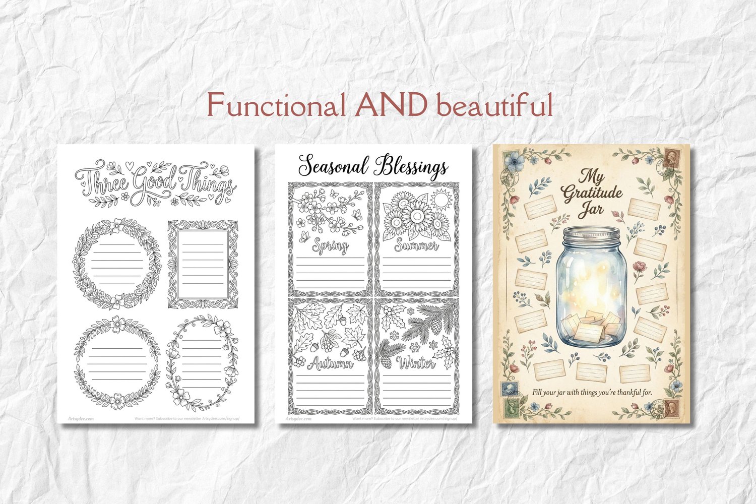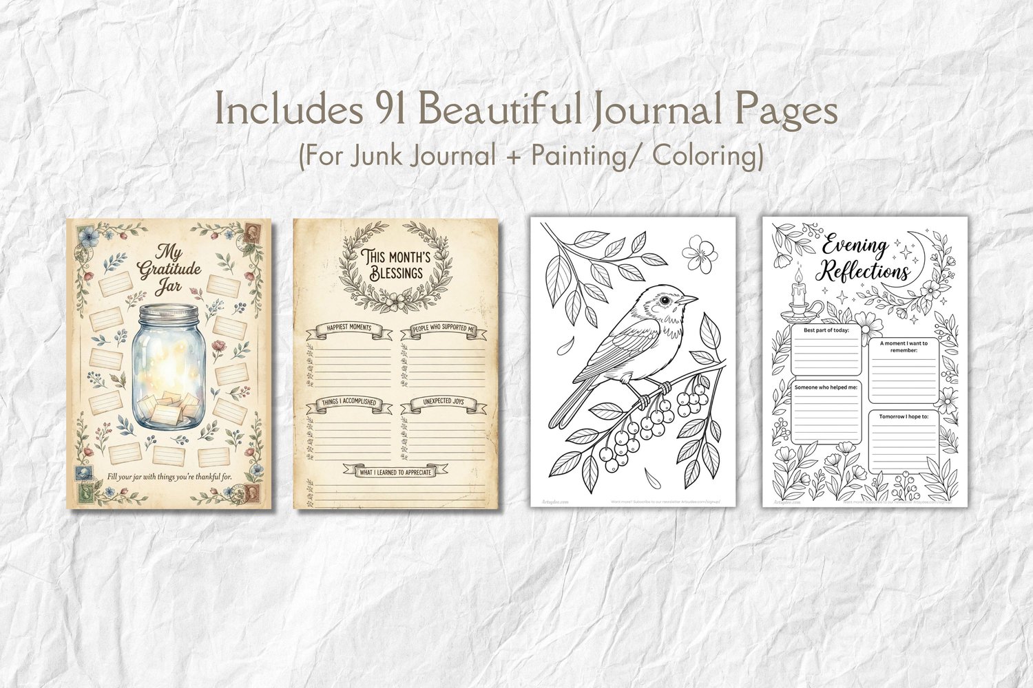 This 91-page printable kit combines watercolor coloring templates, functional journal worksheets, and gorgeous junk journal elements — everything you need to create your own gratitude journal from scratch.