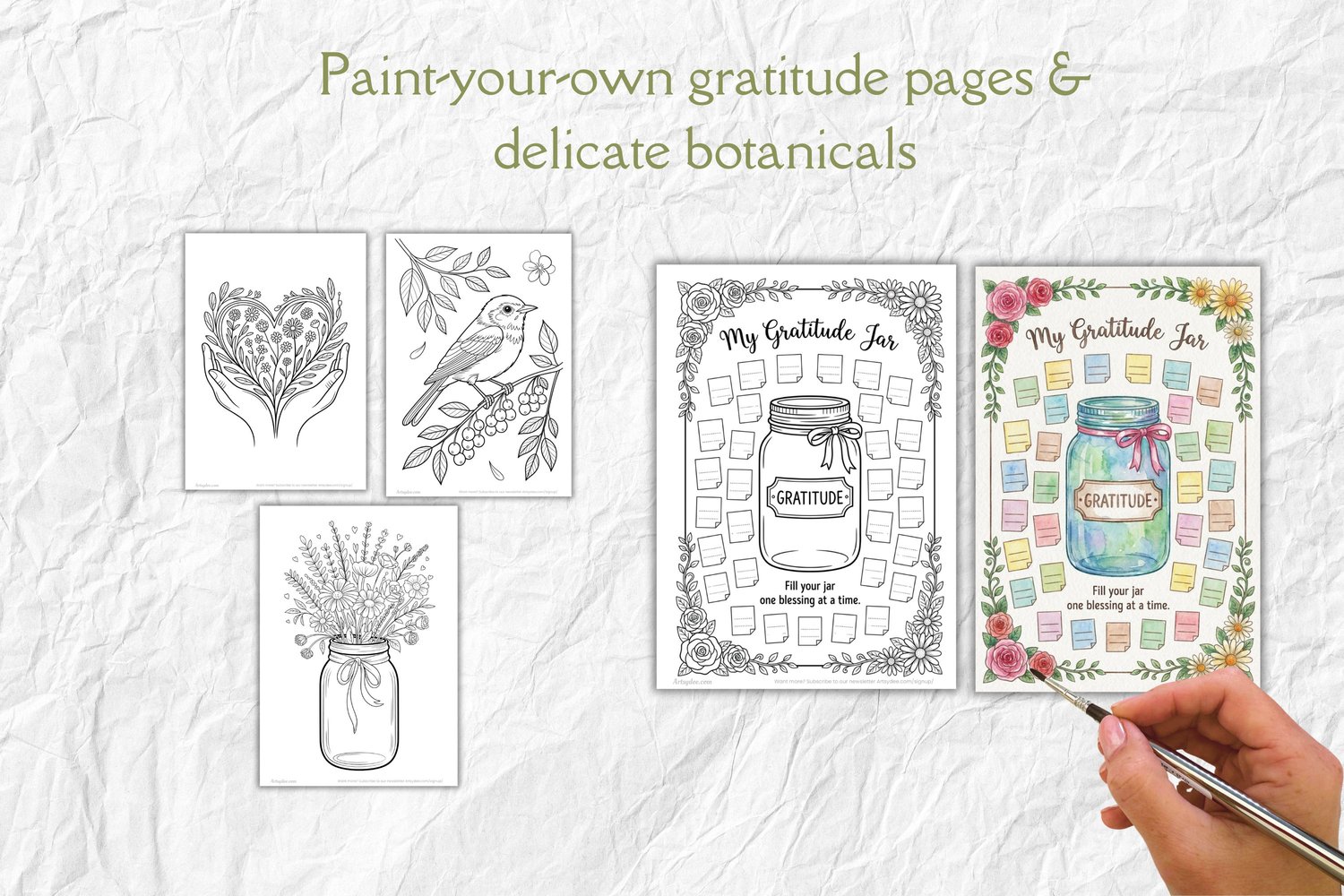 - Functional paintable pages: daily gratitude lists, weekly trackers, reflection prompts