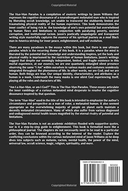 The Hue-Man Paradox is not an academic exhibition flooded with supportive quotes, nor is it a step-by-step guide to enlightenment. This book is formatted more like a philosophical journal. The chapters do not necessarily need to be read in a particular order, they can be browsed according to the interest of the reader. Explore the conflicting conclusions within the curious melanated mind of Jason Williams as he deep dives into subjects such as melanin, racism, mental health, the power of the mind, universal law, occult science, magic, religion, spirituality, and more.