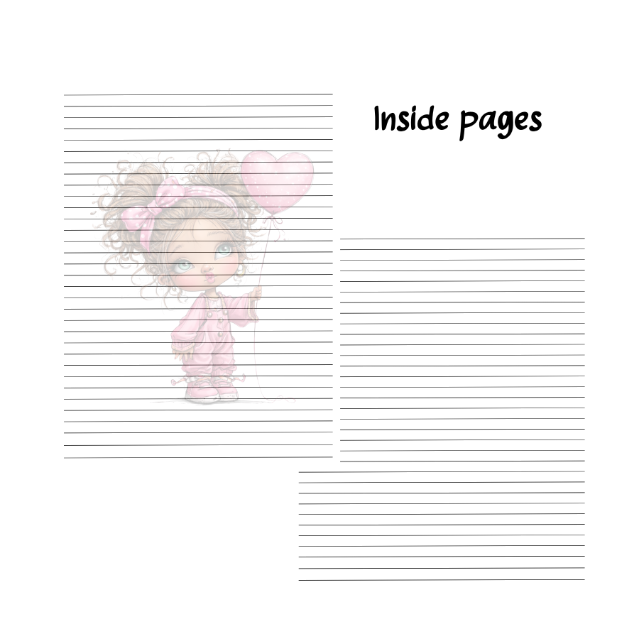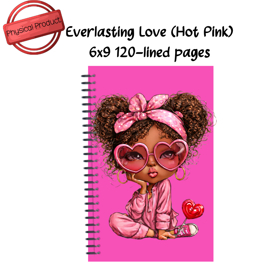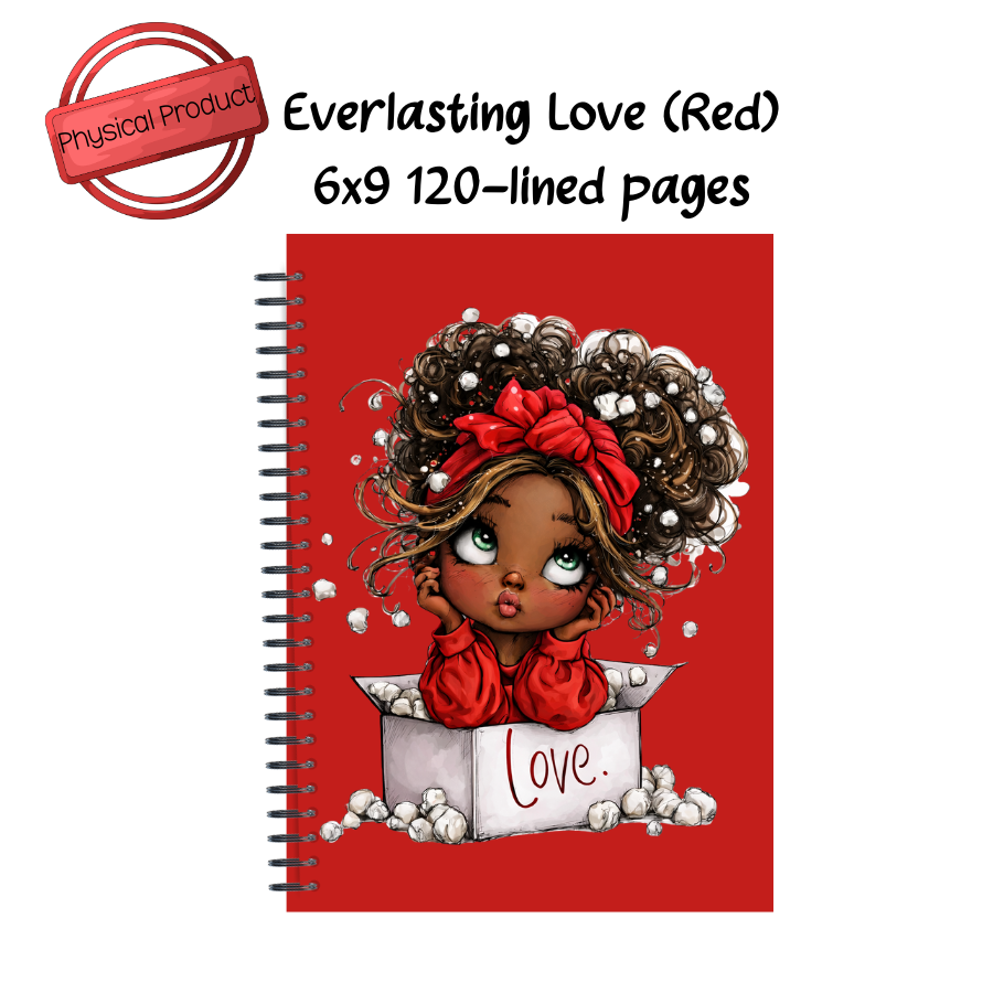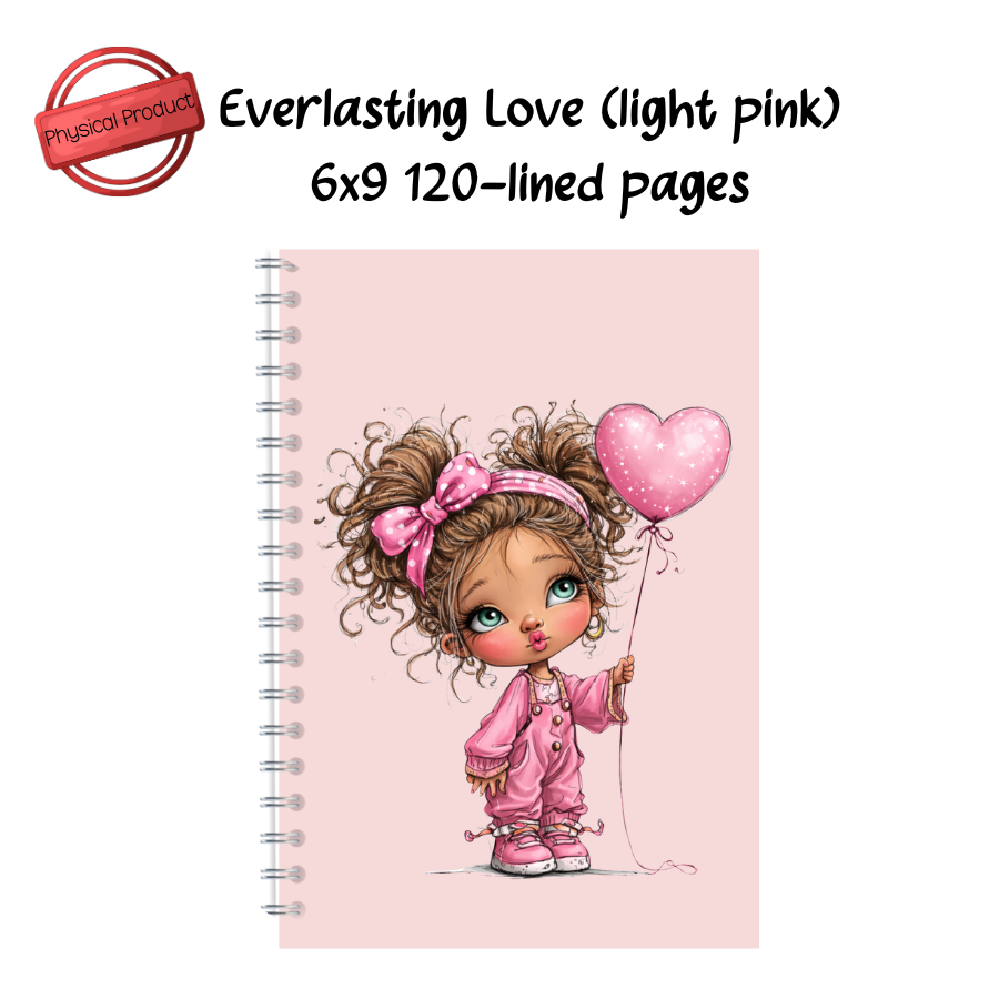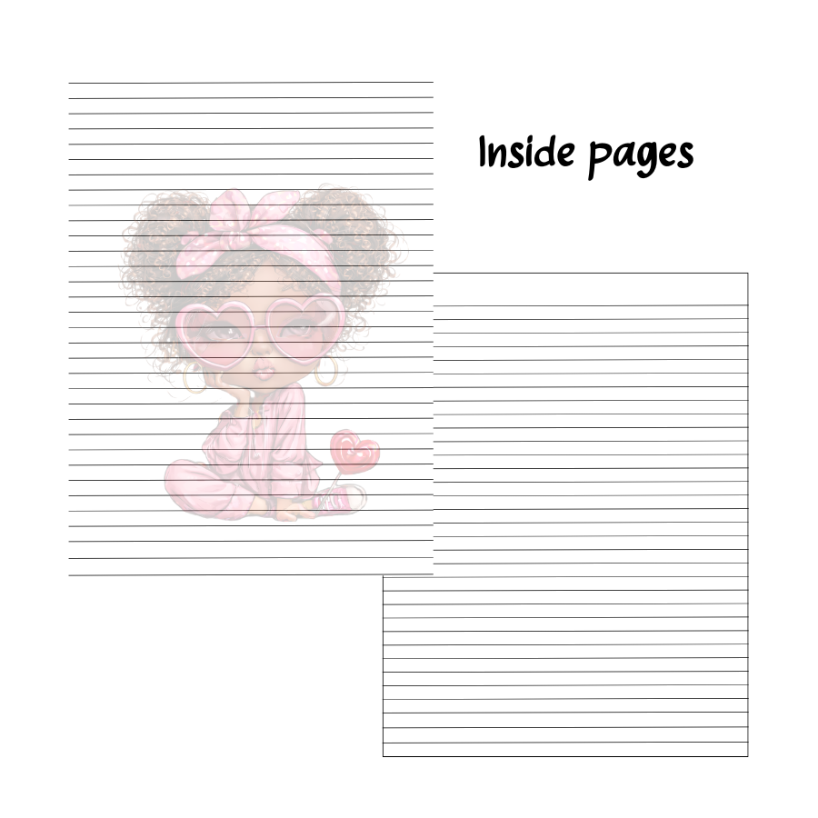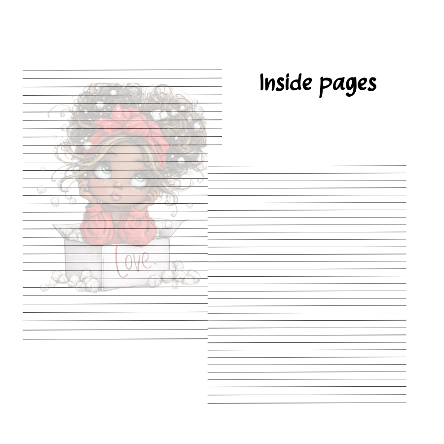 Each journal in the Everlasting Love Collection is handmade with care using quality materials. Every journal measures 6x9 inches and includes 120 lined pages, thoughtfully designed in Canva. Throughout the journal, pages alternate between a beautiful girl image on one page and a plain lined page on the next, creating a unique and expressive writing experience.