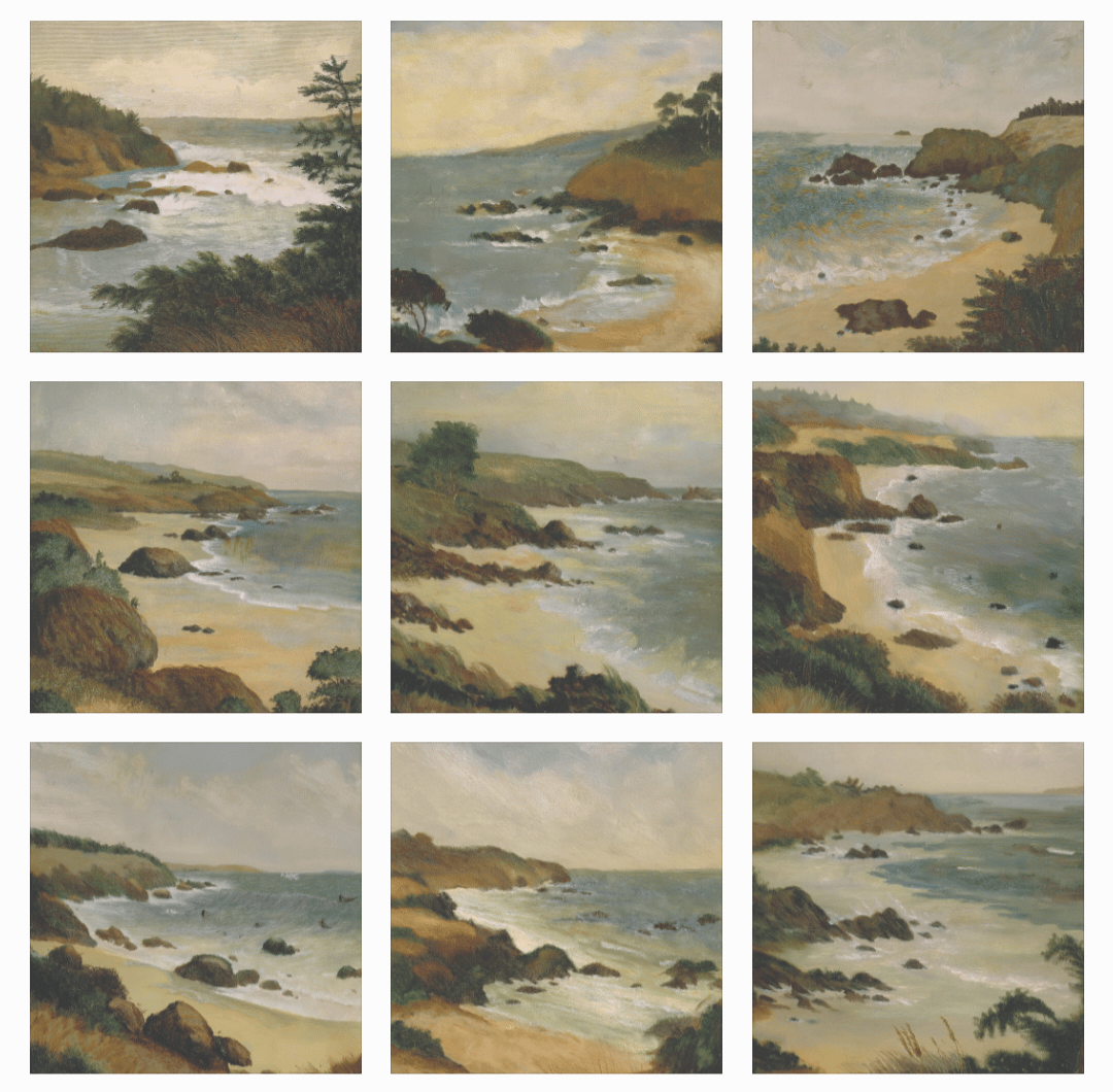 9 unique and high-quality artworks. A painting of a beach, sand, and pine trees; a vintage landscape; a vintage landscape print; a rural field mural; a botanical poster; and prints of pine trees on a beach.