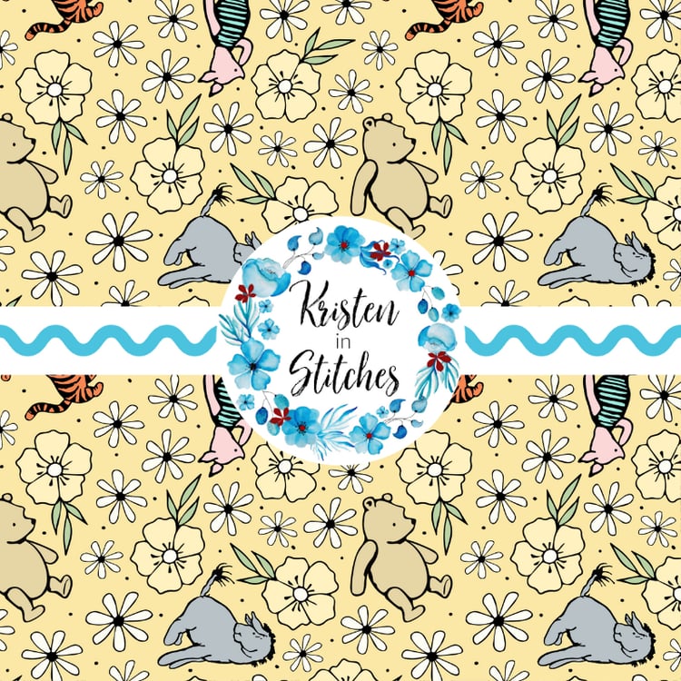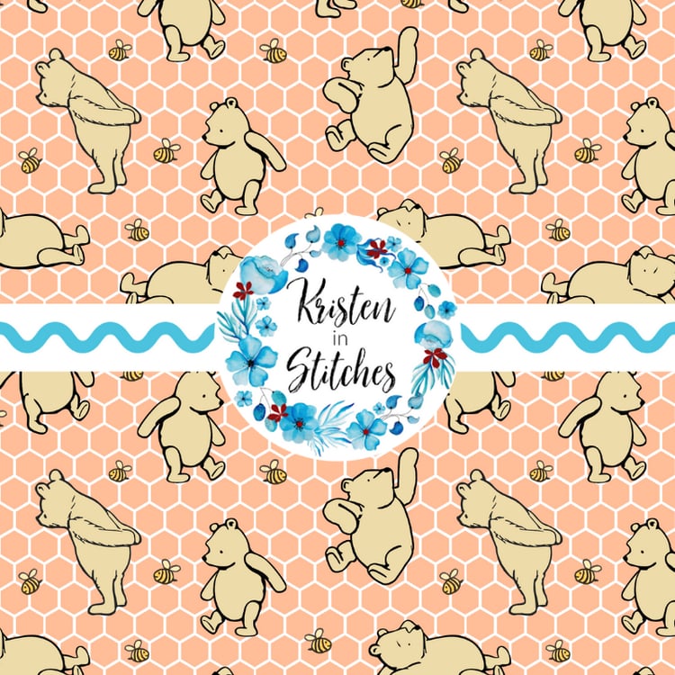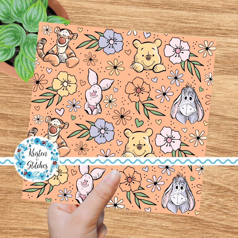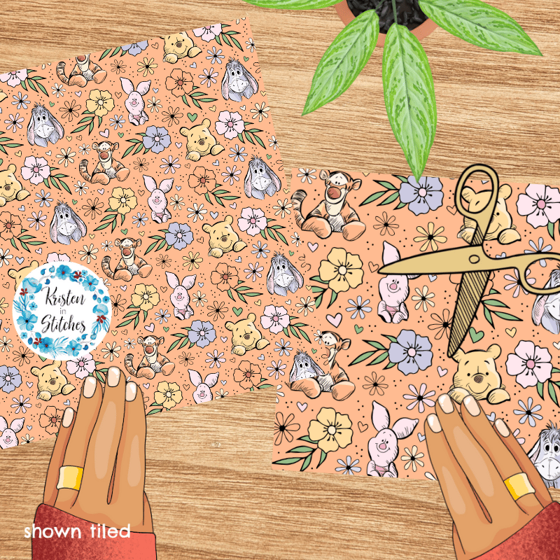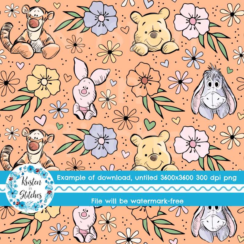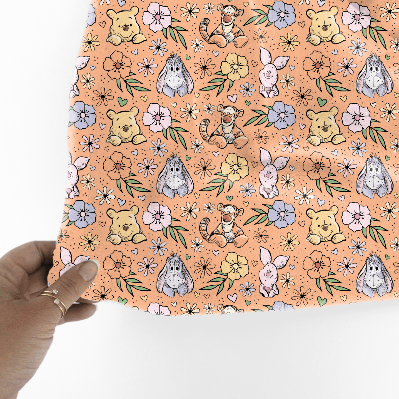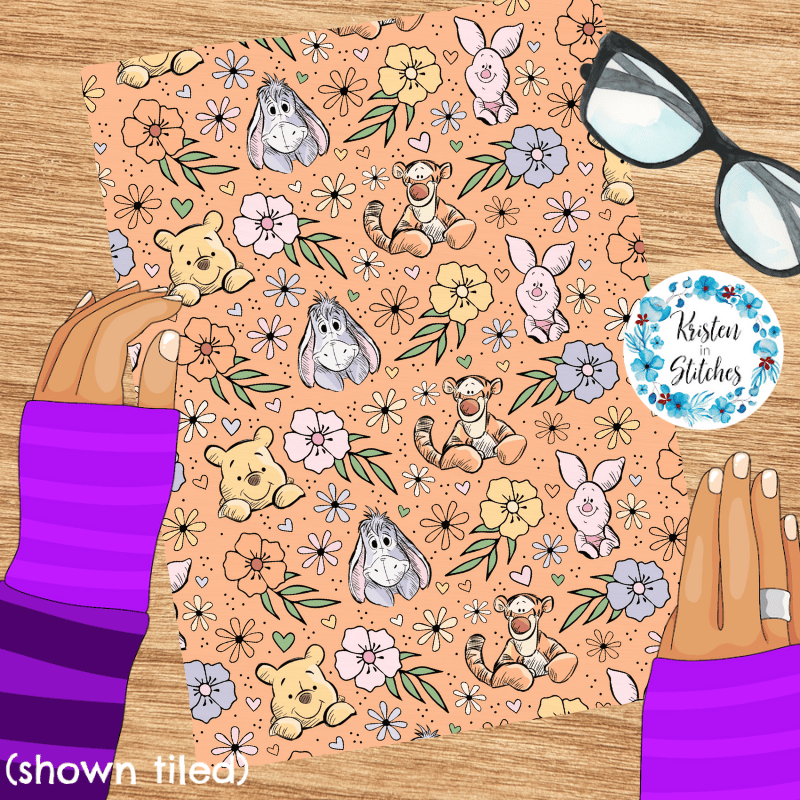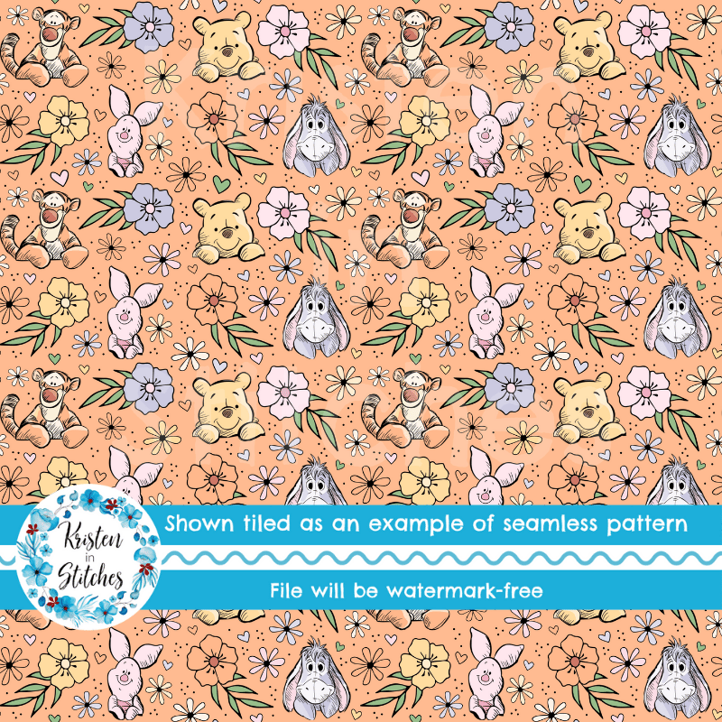 Classic Winnie the Pooh Piglet Tigger Eeyore Nursery Floral Seamless Pattern, Peach