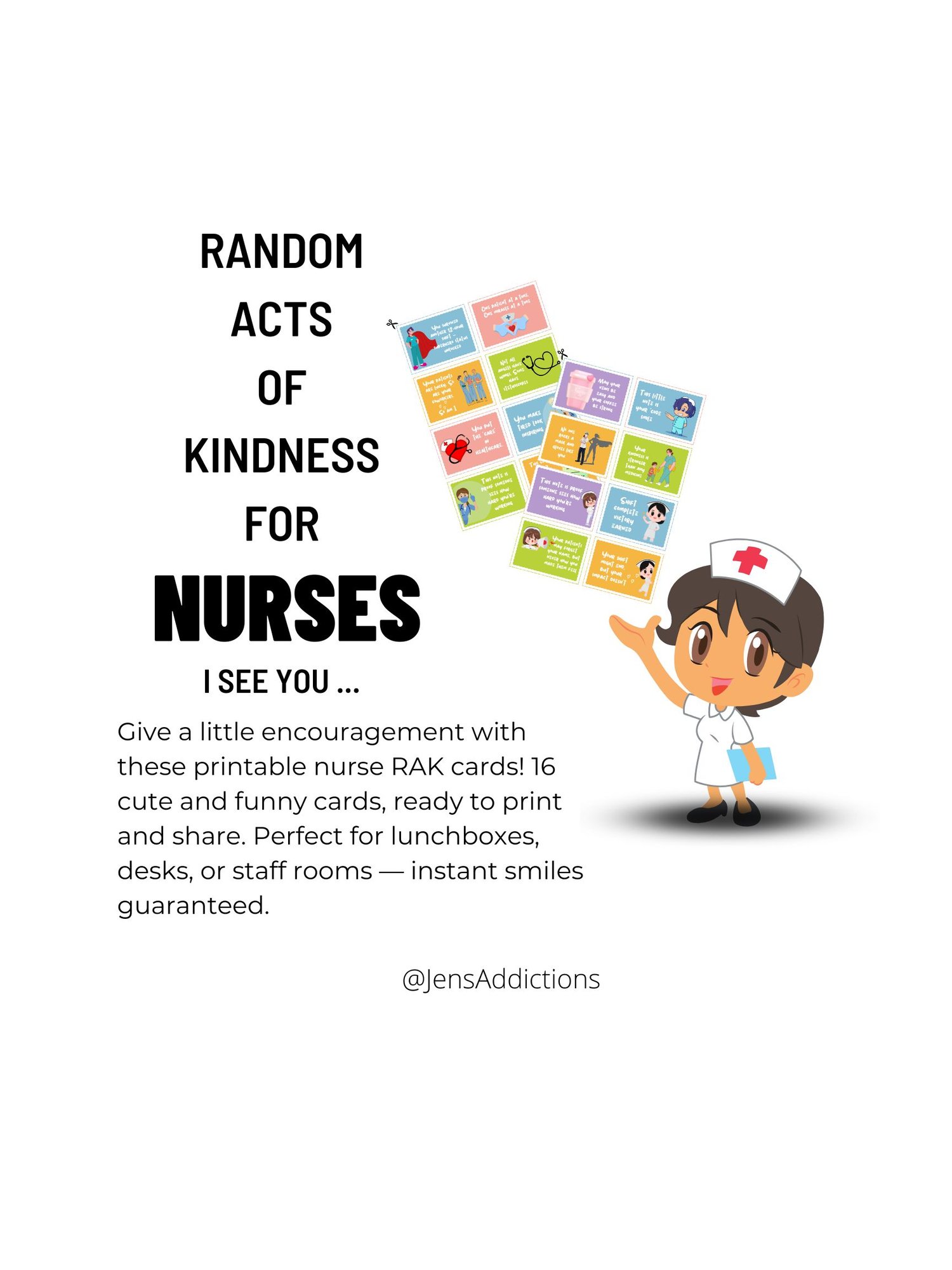 Give a little joy to the hardworking nurses in your life with these printable Random Acts of Kindness (RAK) cards! Perfect for lunch breaks, staff rooms, or surprise encouragement, these cards are designed to brighten a nurse’s day — and they’re ready to print instantly.