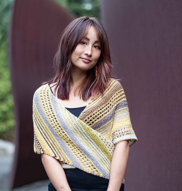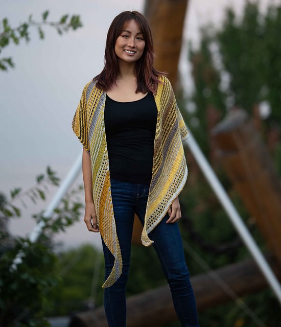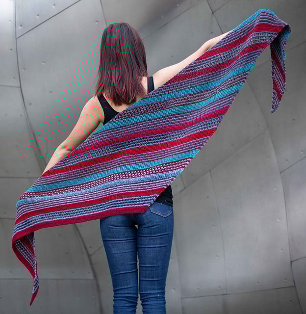 The Snoqualmie Shawl is a versatile two-color shawl with simple stitches that create a beautiful repeated motif. Designed with worsted weight yarn in brightly contrasting colors, it would be just as charming in monochromatic colors or a lighter weight yarn (just add a few repeats). Spincycle’s Dream State collection in any colorway combination makes for an addictive project that will have you knitting just one more row all night long.