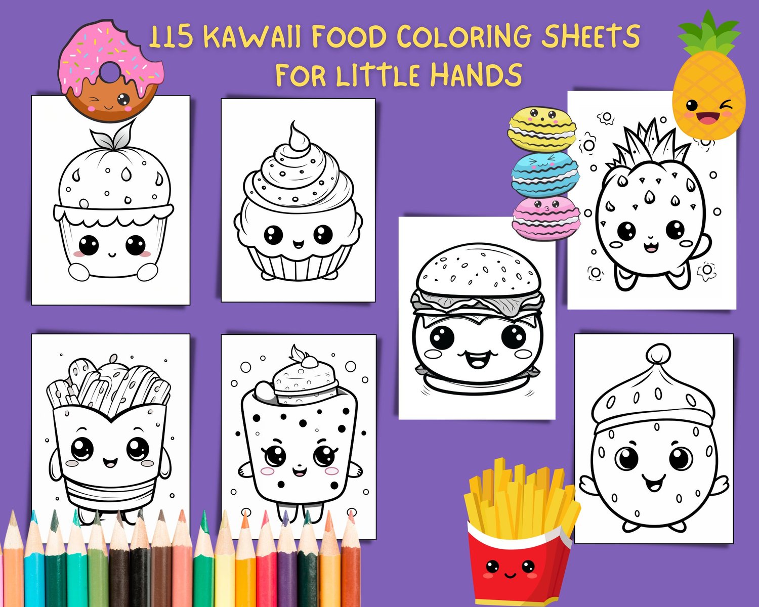 15 Printable Kawaii Food coloring pages for kids, toddler and preschoolers. 115 Easy and Simple Kawaii Coloring pages for Preschool , Kindergarten and Homeschooling. Perfect for little hands to help them develop their pincer grip and color yummy Kawaii Food pages, making learning and coloring fun.