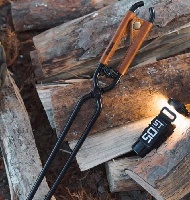 Carbon Steel Camping Fire Tongs with Leather Grip – Heavy-Duty Log & Charcoal Handling Tool