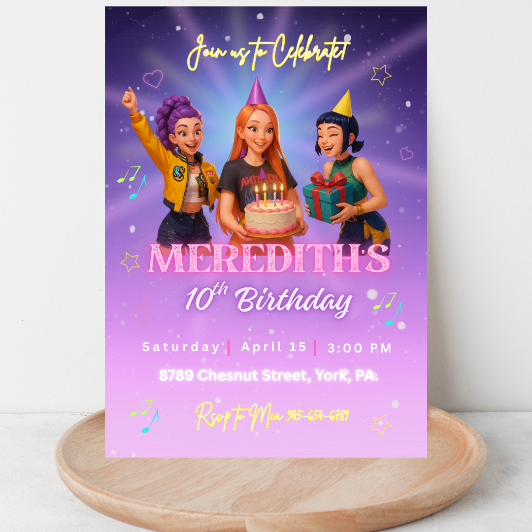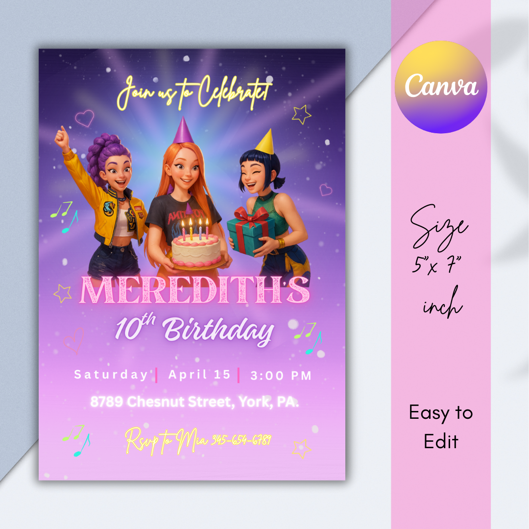 Get ready to celebrate in style with this K-pop Demon Hunters themed birthday invitation! Perfect for fans of music, action, and adventure, this vibrant design is easy to customize in Canva — no special software needed.