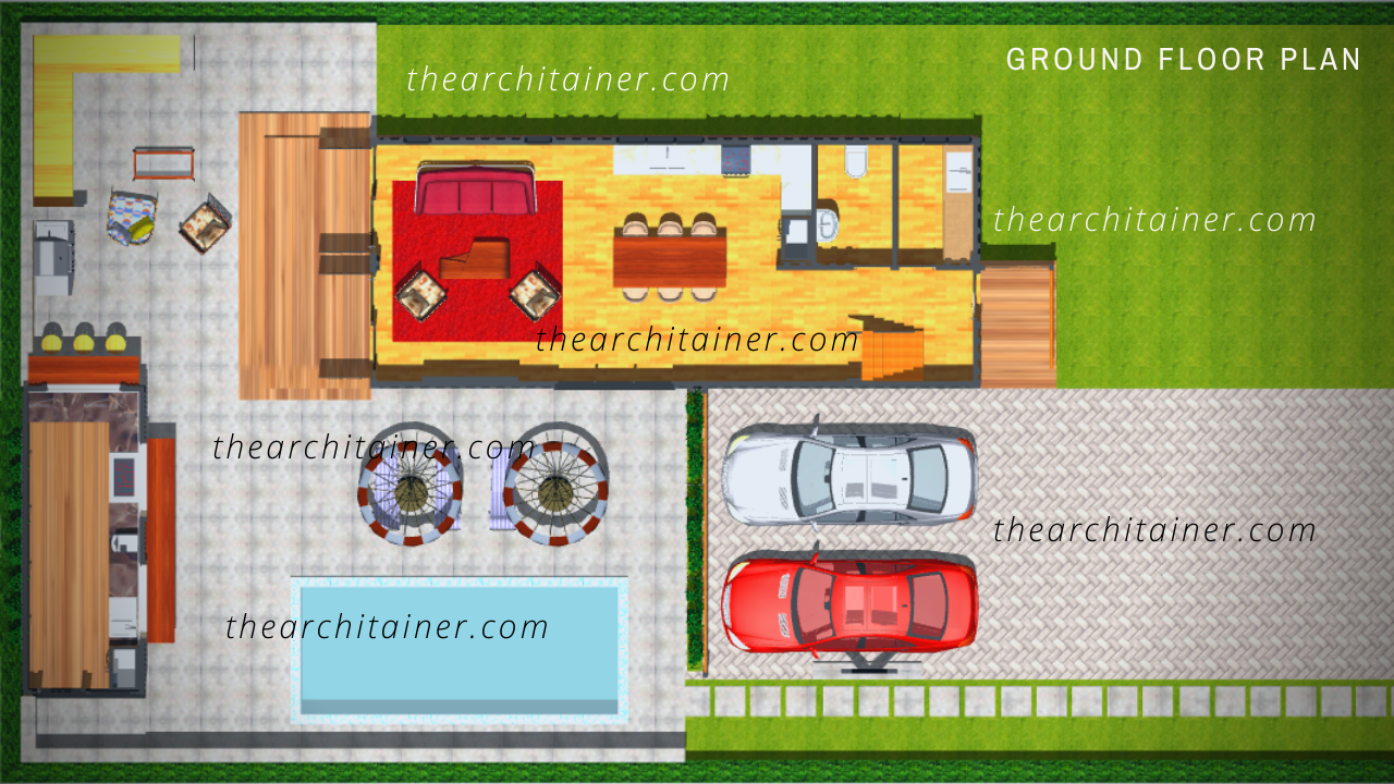 This modern house plan is an architectural masterpiece designed using four 40-foot shipping containers. The containers are stacked two-on-two to create a modern container floor plan with 3 bedrooms, 2.5 bathrooms, and an open-plan living area. Additionally, the house boasts a swimming pool on the rear, surrounded by a spacious pool deck area and outdoor living space perfect for entertaining.