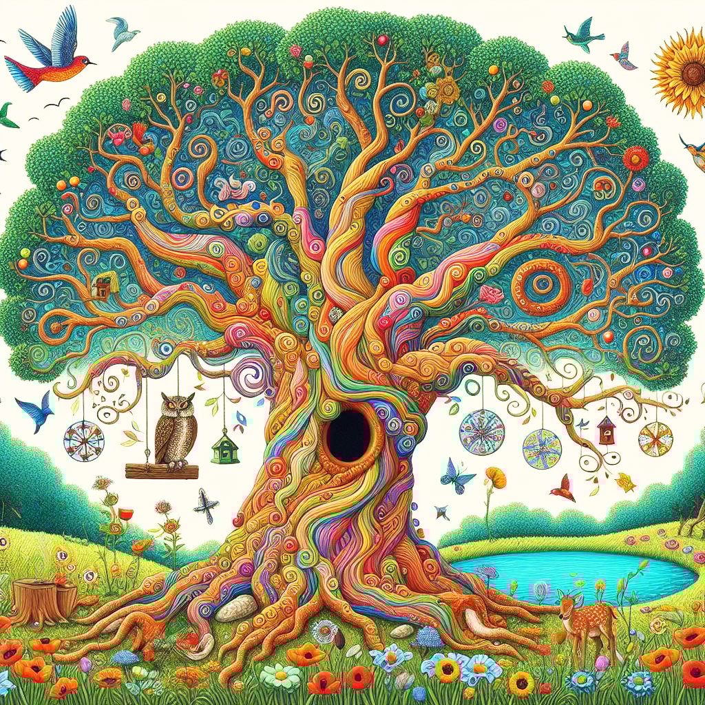 A big old oak tree, with elaborate colourful patterns throughout. It has deep roots & curly branches with green & blue leaves. There is an owl on the tree. It has beautiful glass bird houses & spinners hanging from its branches. There are colourful humming birds & robins. On the ground there are poppies & sunflowers & the tree is surrounded by a lake. There is a deer lying amongst the flowers.