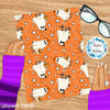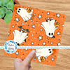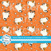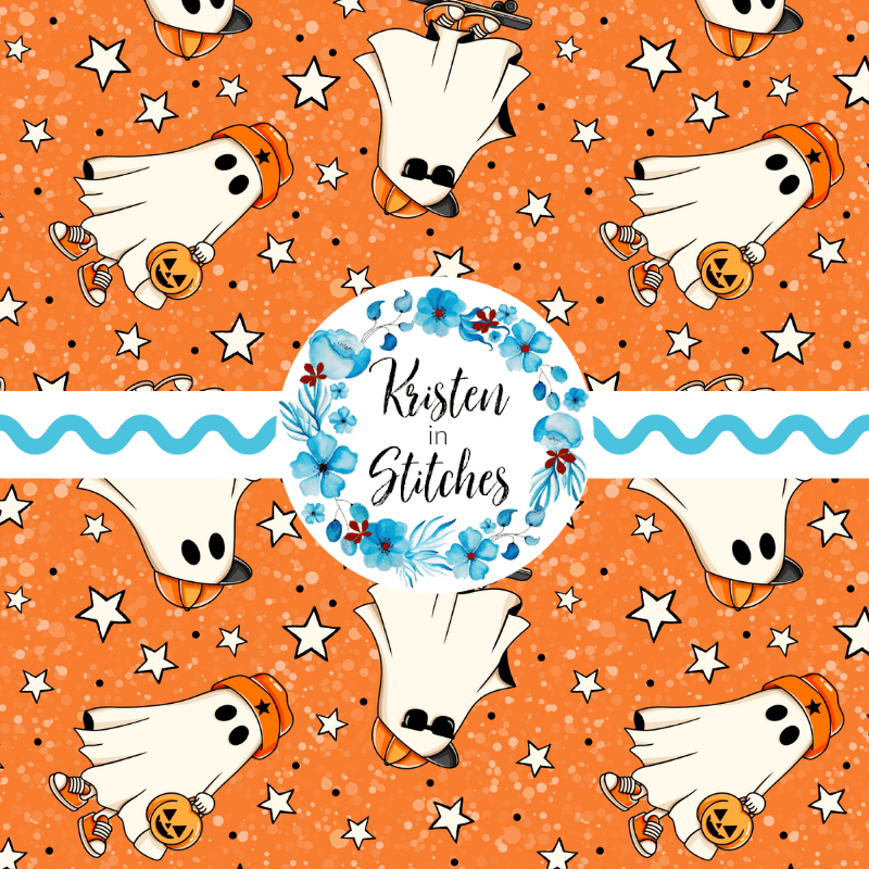 Cool kids skateboarding ghosts with baseball caps, sunglasses, sneakers and pumpkins on orange.