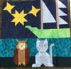 The quilt block measures 30" x 30" when finished in a quilt. The pattern is comprised of four parts, the stars, the boat, the owl and the cat, which are pieced separately and then sewn together to complete the full block. This was designed as a part of the 2019 Row Along called Once Upon A Story, hosted by Seams To Be Sew.