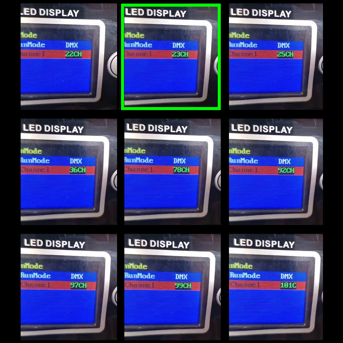 * En el modo de "23CH" Verifique, con un Fixture de pruebas (click), que coincidan estos canales: 1 Pan, 3 Tilt, 8 Dimmer, 13 Blanco y 9 Strobo.