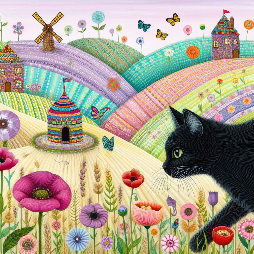 A black cat wandering through a corn field on high patterned hills with poppies, daisies, & toadstools. There are humming birds & butterflies. There is a colourful windmill & a mouse hides in a flower.
