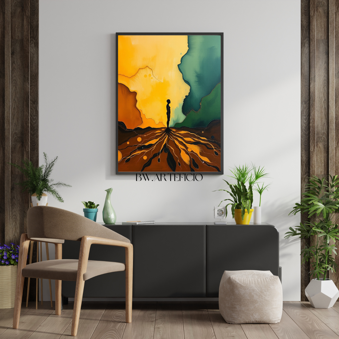 This digital artwork features a silhouette of a person standing at the center of the composition, with roots extending from the feet into the ground. The background is divided into two contrasting color schemes: a warm, vibrant yellow-orange on the left and a cool, calming green on the right. The roots are depicted in shades of brown and orange, blending into the earthy tones of the ground. The overall style is abstract and surreal, focusing on the connection between the individual and the earth.