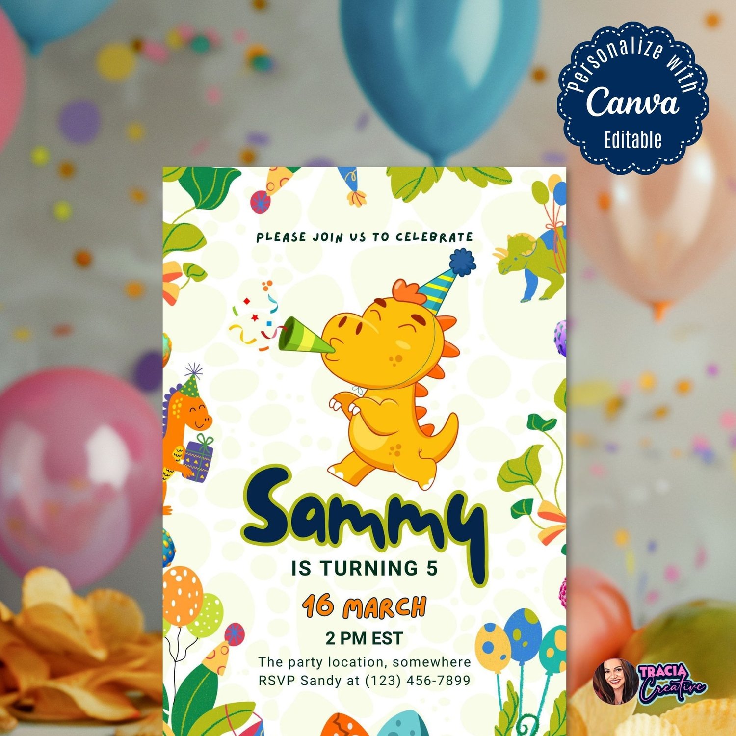 Editable Canva Dinosaur Kids Birthday Invitation - Digital Download PDF | Party Printable