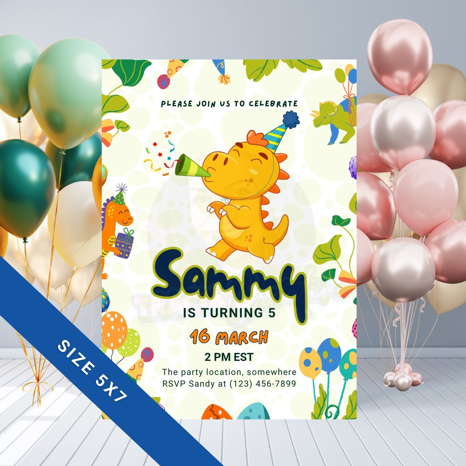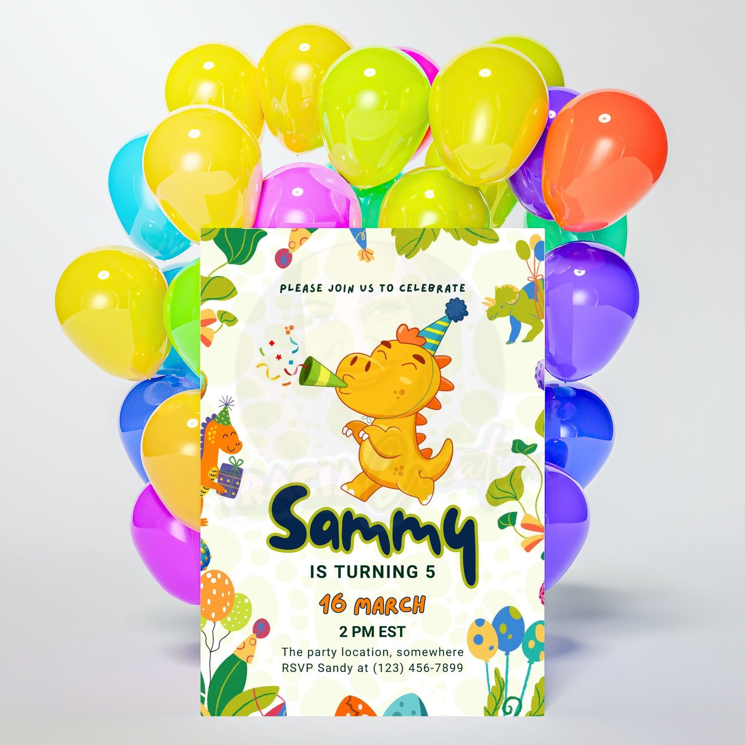 Make your child's birthday roar with excitement using our vibrant dinosaur invitation!