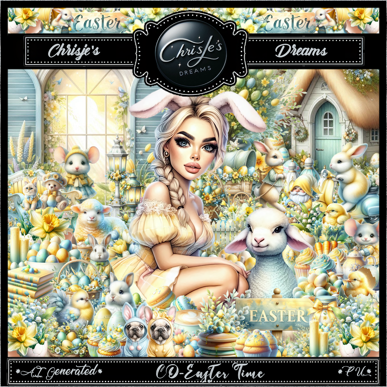 Easter Time is a 🐰Easter 🐰themed kit which contains 163 elements, 8 Frames, 29 papers and 2 beautiful AI generated png tubes by Chrisje's Dreams.