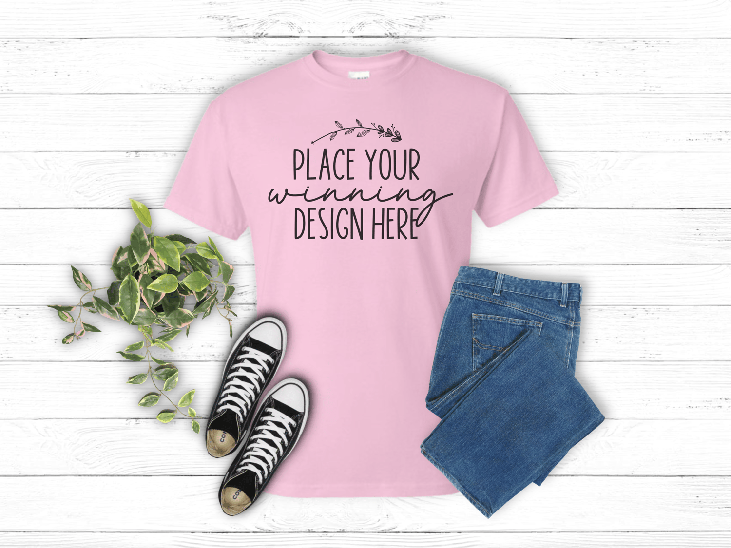 light pink shirt mockup Gildan 8000 unisex t-shirt Gildan 800 dryblend mock up flat lay tee G800 mens womens mockups minimalist jpg download