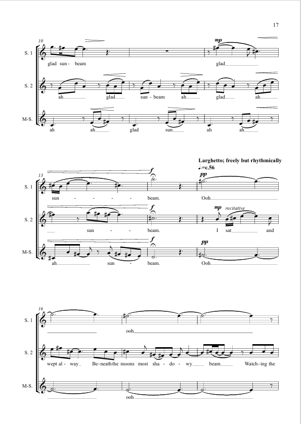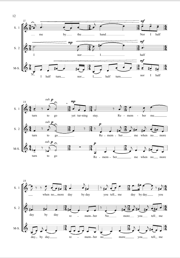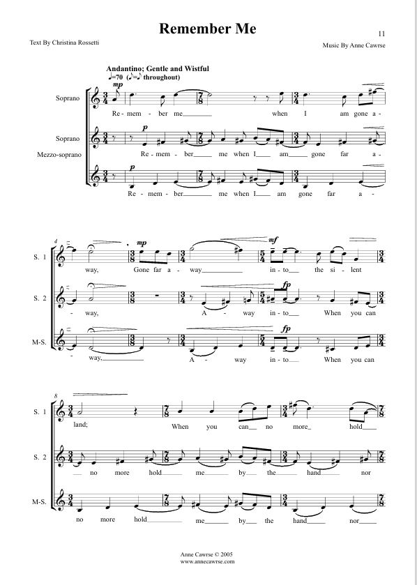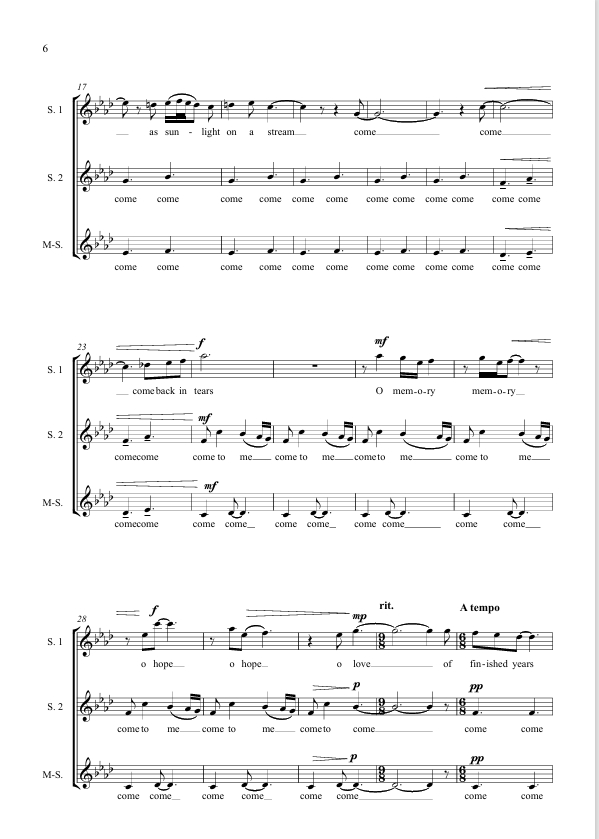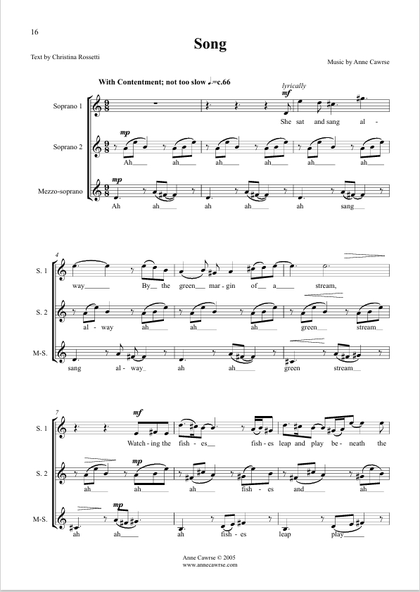 Despite the themes of love, death and despair, I find an inherent beauty in these lyrics, and find the language Rossetti uses particularly feminine, strong and evocative. I have used both church modes and exotic modes to match the mood changes within the text, reflecting the narrator’s changing state of mind from light to dark, from hope to melancholy.