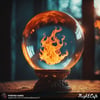 This image shows a crystal ball engulfed in flames. The shot has a cinematic quality, enhanced with film grain, vignette, and dramatic, atmospheric lighting.