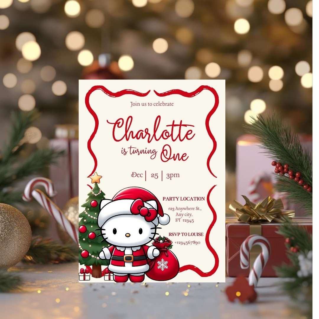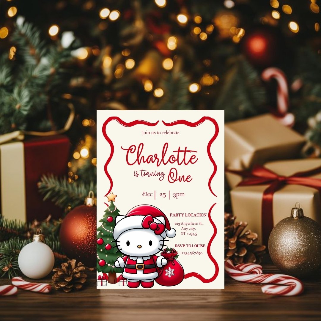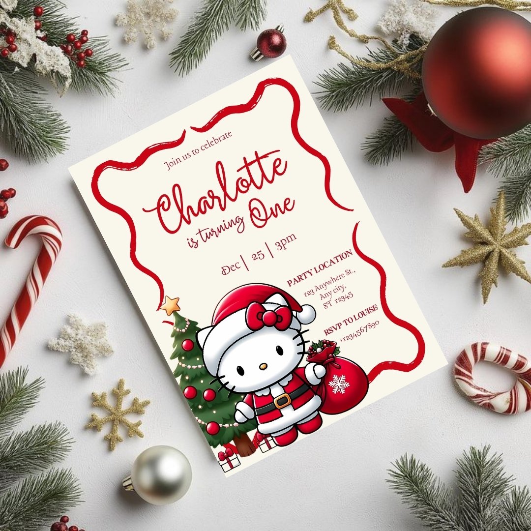 Make your child’s holiday celebration extra magical with this Hello Kitty Christmas Birthday Invitation! 🎄✨ This adorable digital invite features Hello Kitty dressed in festive Christmas style, perfect for a first birthday, kids’ holiday party, or Christmas-themed celebration.