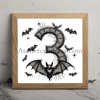 Number 3 coloring book halloween occupying 90% of a 1024x1024 image. Use an Old English font style with clear outlines resembling a coloring book page. The character is composed of intricate bat silhouettes, creating a spooky Halloween atmosphere. Use only pure black (#000000) for the character and outlines, and white for the background.2D, black and white style resembling a high-quality adult coloring book page.
