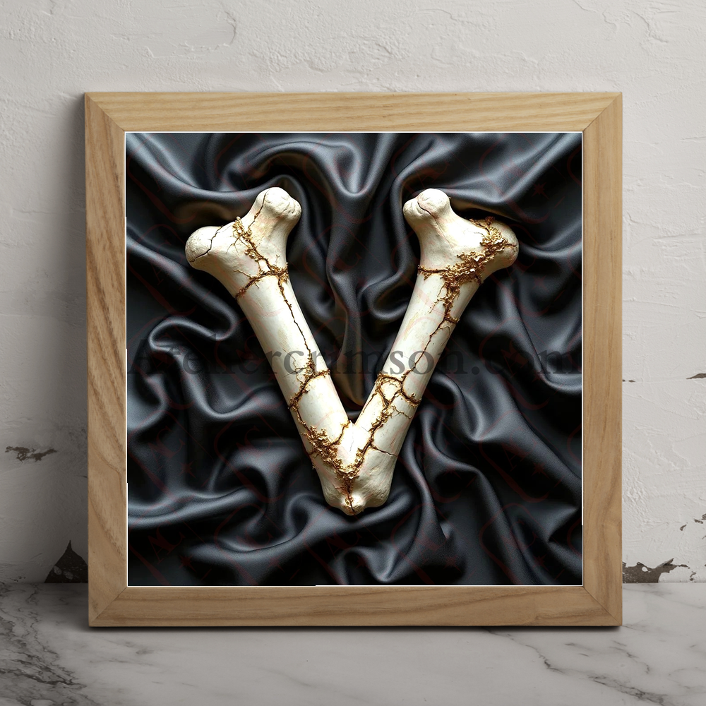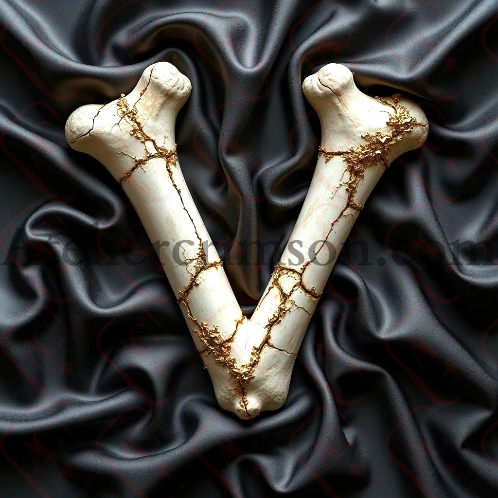 The letter V Bones with gold fissures A hauntingly beautiful character crafted from pristine human femur bones, intricately arranged to form a bold, serif typeface. Delicate golden fissures, reminiscent of kintsugi art, weave through the ivory-white osseous structure, adding an element of elegant repair. The character stands proudly on a luxurious marbled floor, its form casting subtle shadows. Behind it, a textured black linen backdrop provides a striking contrast, emphasizing the letter's ethereal beauty.