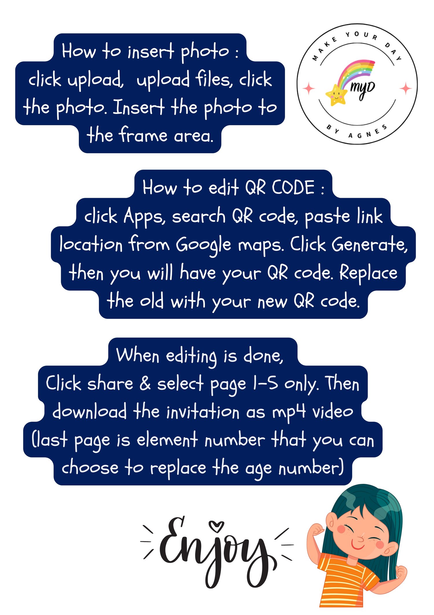 name, age, date, time, address of party, picture, RSVP number. Then we will send the final file to your email.