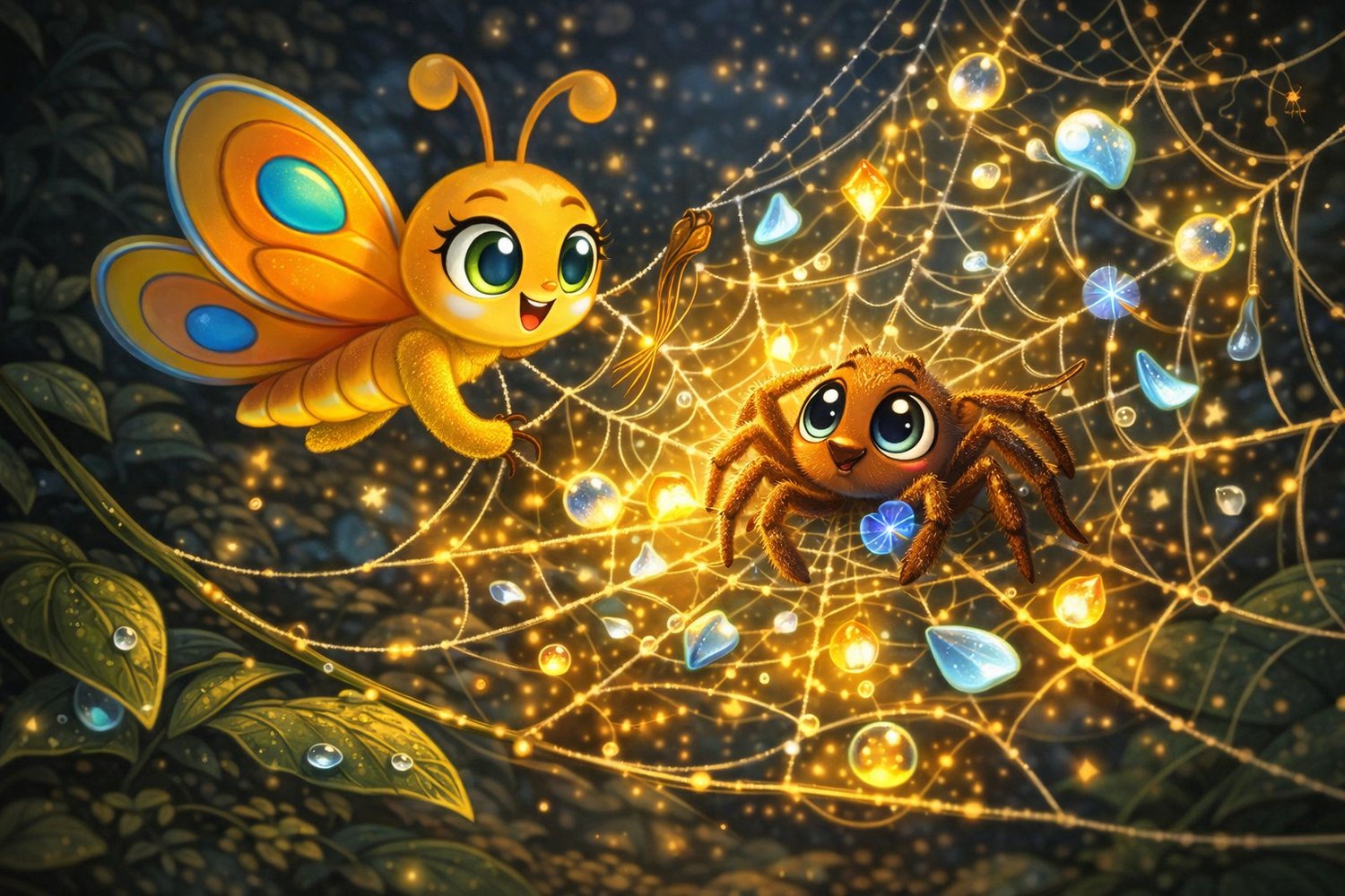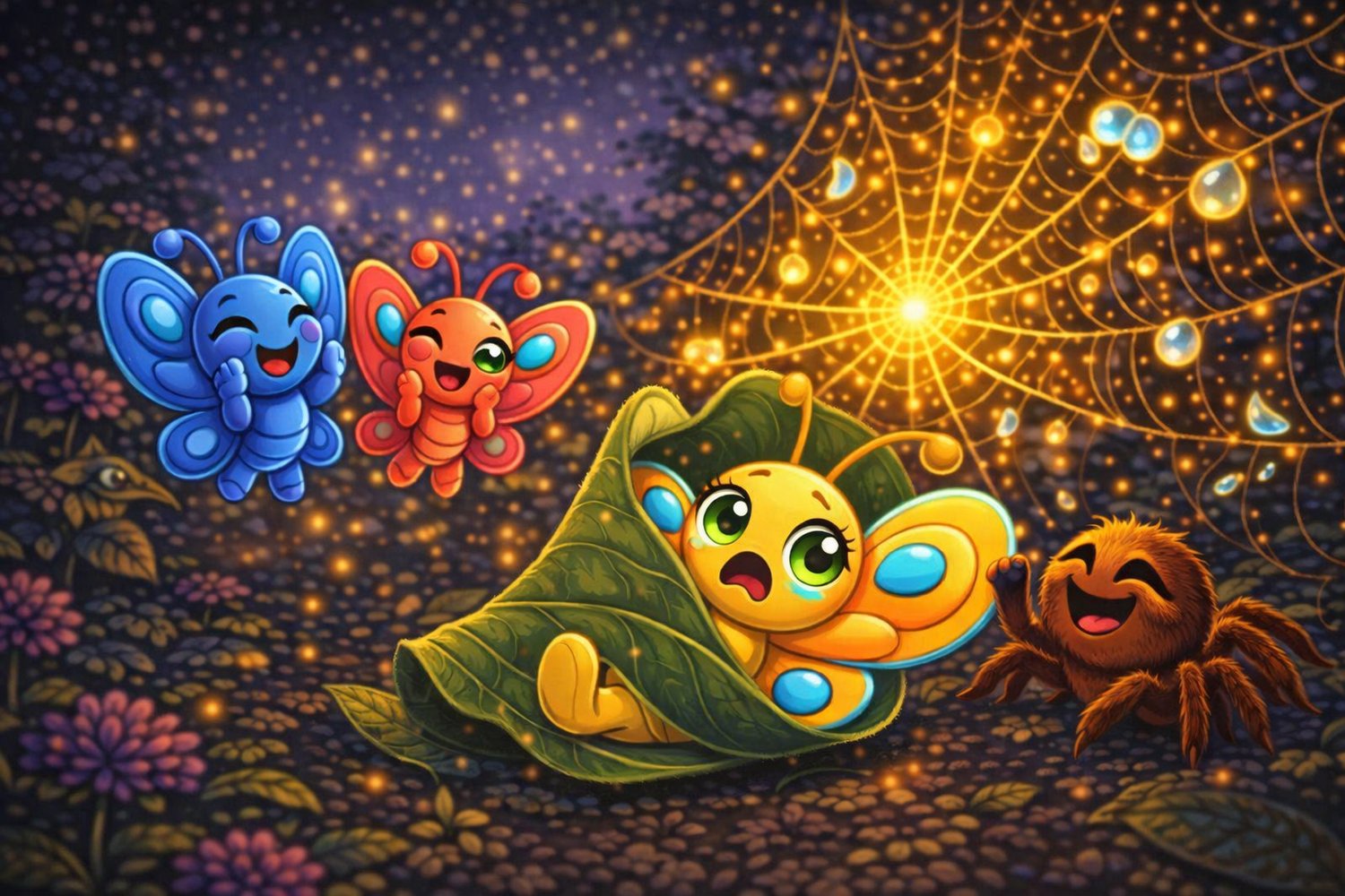 When night falls over Flutterby Meadow, a tiny spider named Spindle feels very scared. His web feels too big… too quiet… and much too dark.