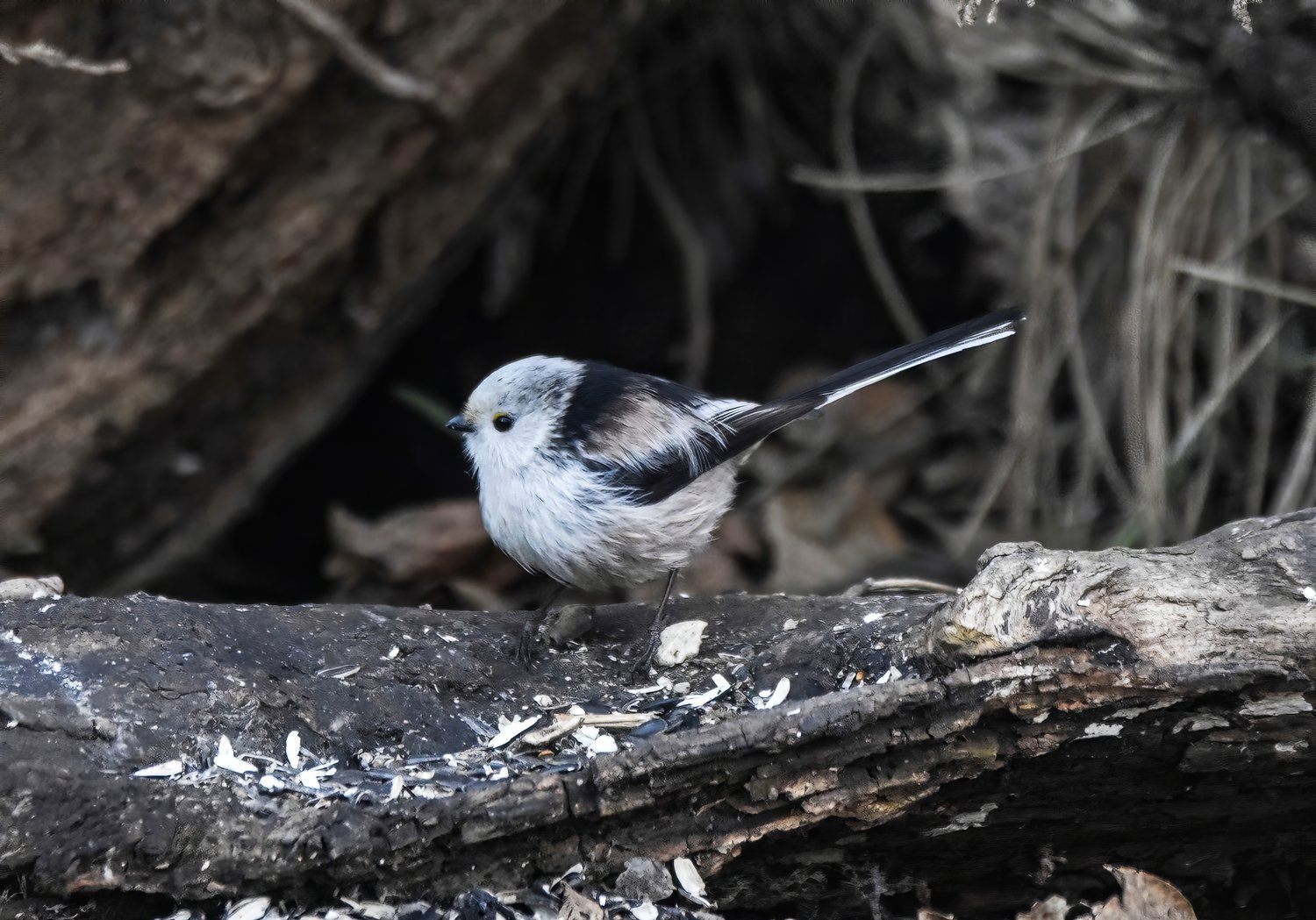 A small tit bird standing on a fallen tree trunk in a woodland setting. The soft grey and white feathers and the muted forest background create a quiet, natural atmosphere focused on wildlife and seasonal calm.