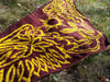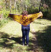 This striking double knit shawl pattern features two gryphons rising around a sun with free-form Celtic knot wings.