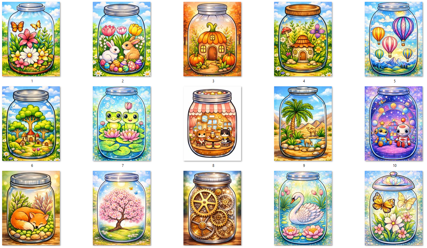 Bring creativity to life with this charming Beautiful Life in Jar Coloring Pages collection! This pack features 100 bold and easy illustrations designed for both kids and adults, making it perfect for relaxing coloring books, creative projects, and Amazon KDP publishing. Each page highlights beautiful scenes and objects inside jars, creating a fun and imaginative coloring experience.