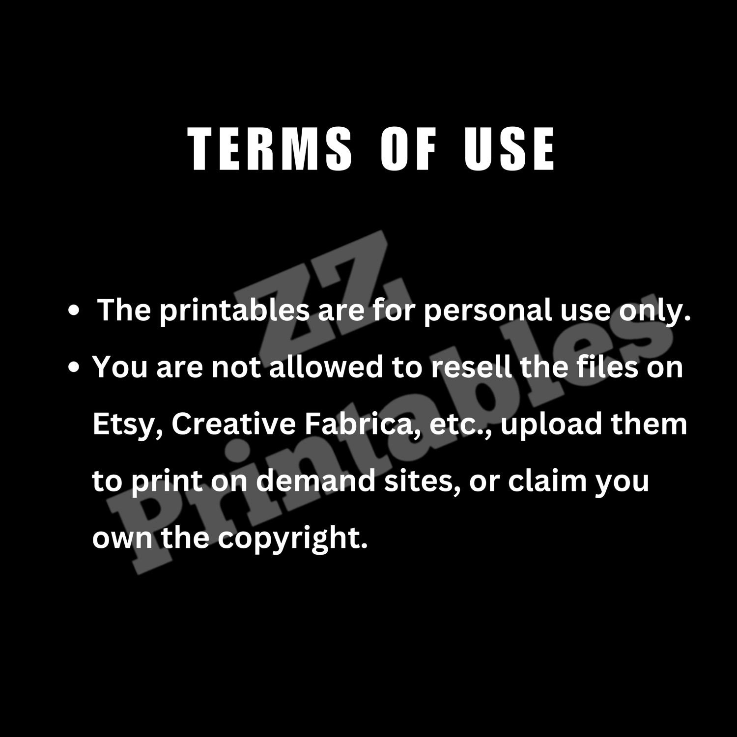 The printables are for personal use only. You are not allowed to resell the files on Etsy, Creative Fabrica, etc., upload them to print on demand sites, or claim you own the copyright.