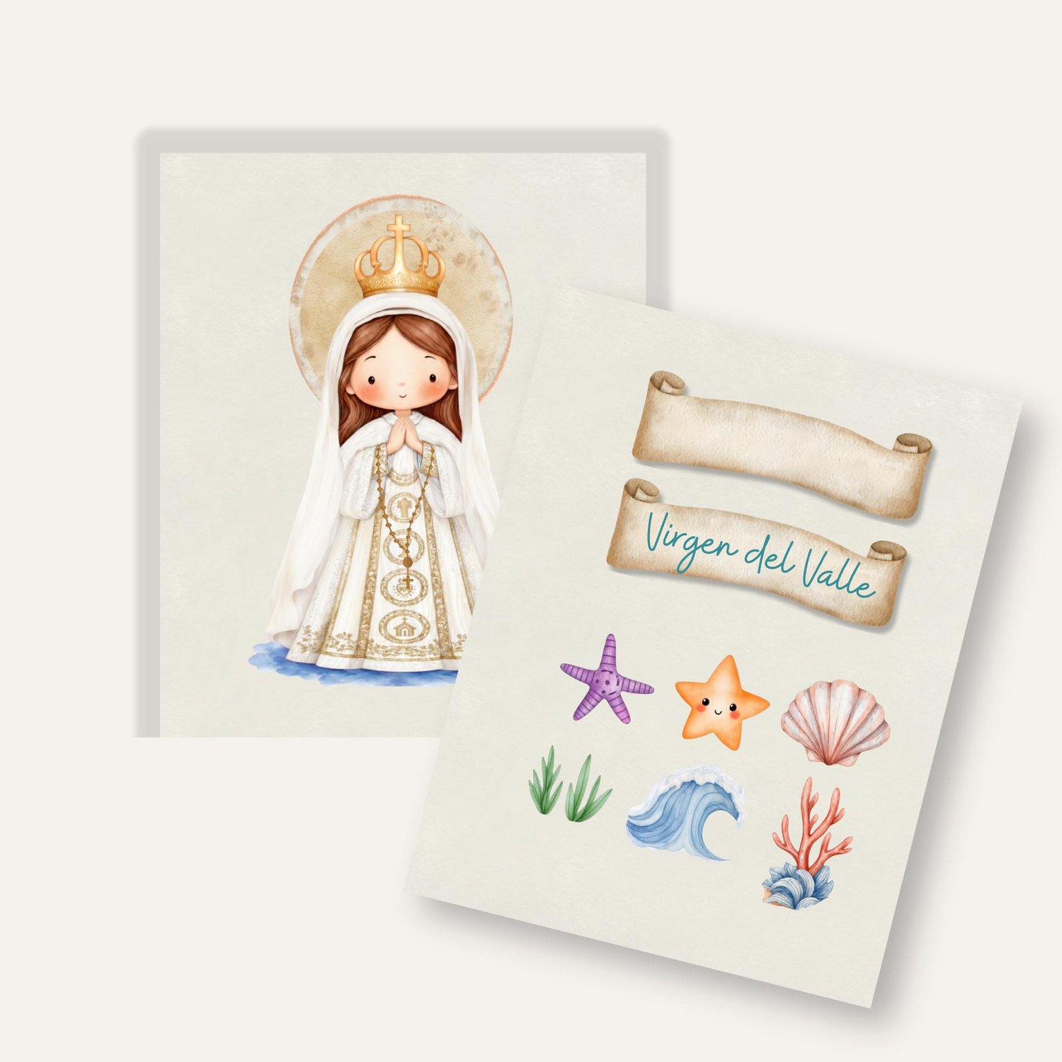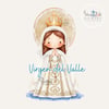 1x Ilustración principal de la Virgen del Valle: La imagen de la Virgen con el Niño Jesús, en su tradicional vestimenta, en un estilo dulce y moderno. Ideal para estampitas, oraciones, recordatorios y más.