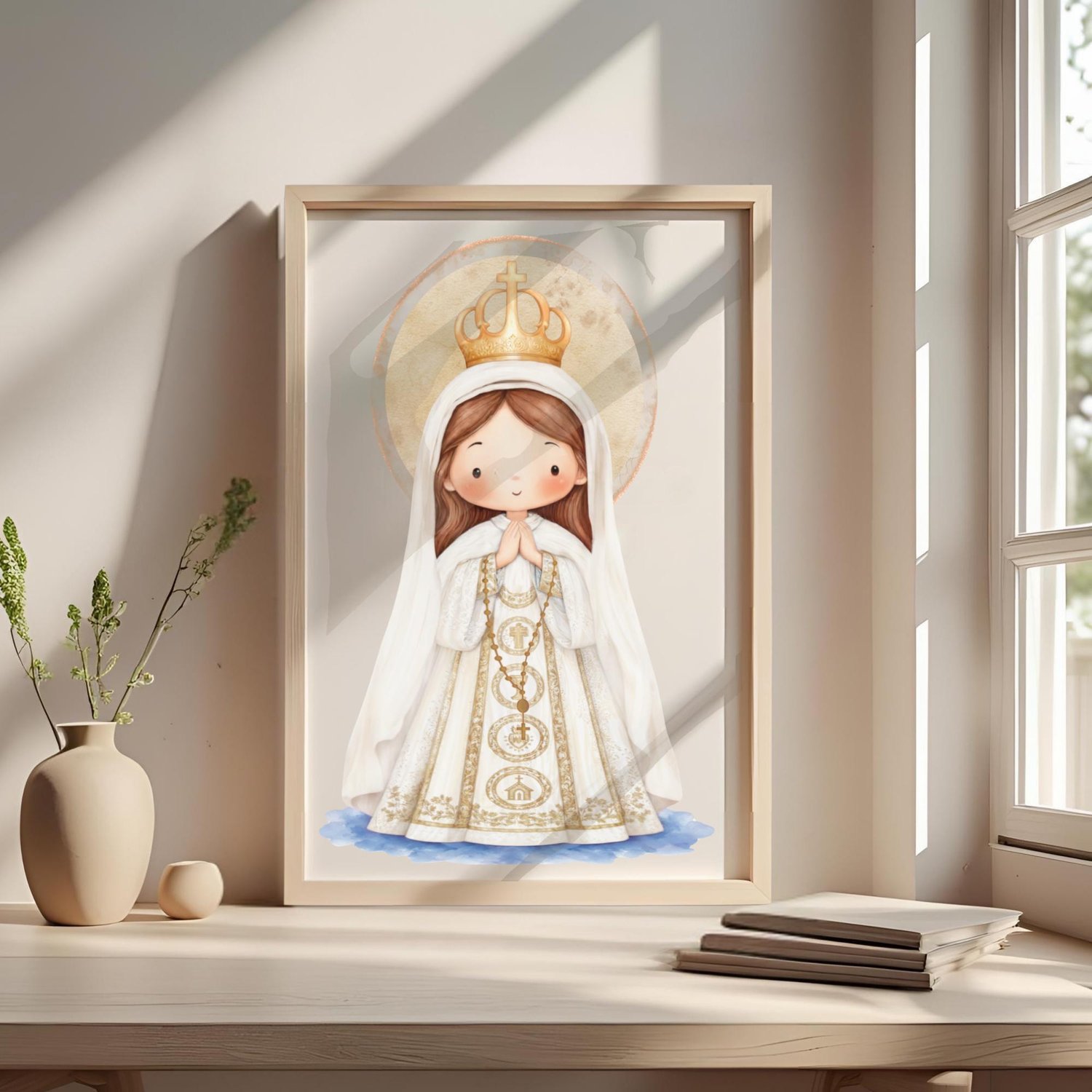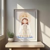 Rinde homenaje a la amada Virgen del Valle, Patrona de Oriente de Venezuela y Protectora de los Pescadores, con esta hermosa ilustración digital en acuarela. Su historia, ligada al mar y a la fe de los marineros, es un faro de esperanza y protección. Capturada en un estilo tierno y delicado, esta imagen es perfecta para una variedad de proyectos creativos y devocionales.