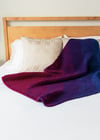 Holding three strands together, switch out one at a time to generate the smooth continuous colour shift from corner to corner. The blanket is worked in Garter Stitch on the bias. Three strands of yarn are held together throughout. This pattern has no charts.
