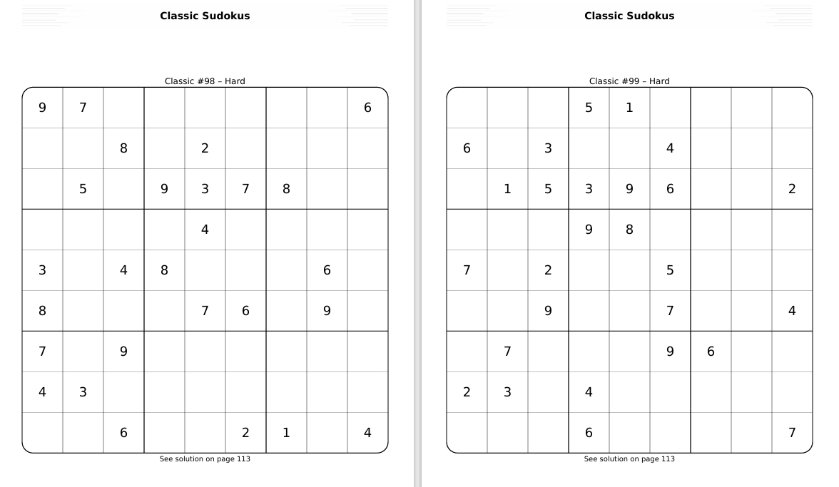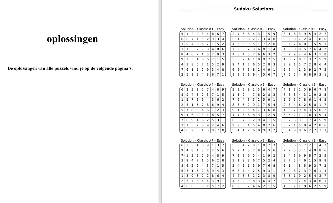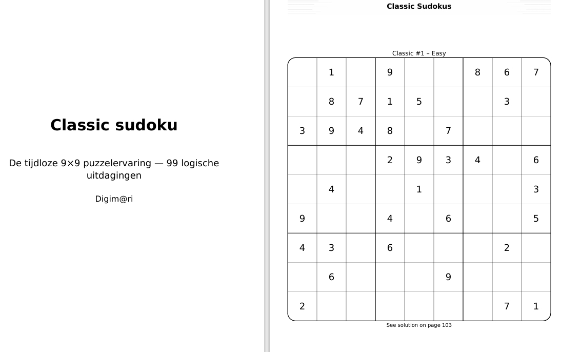 Een compacte editie met 99 A4‑printbare sudoku’s in drie niveaus: Easy, Medium en Hard.