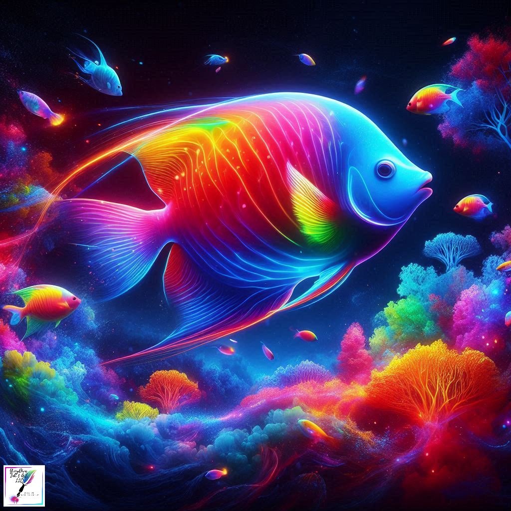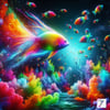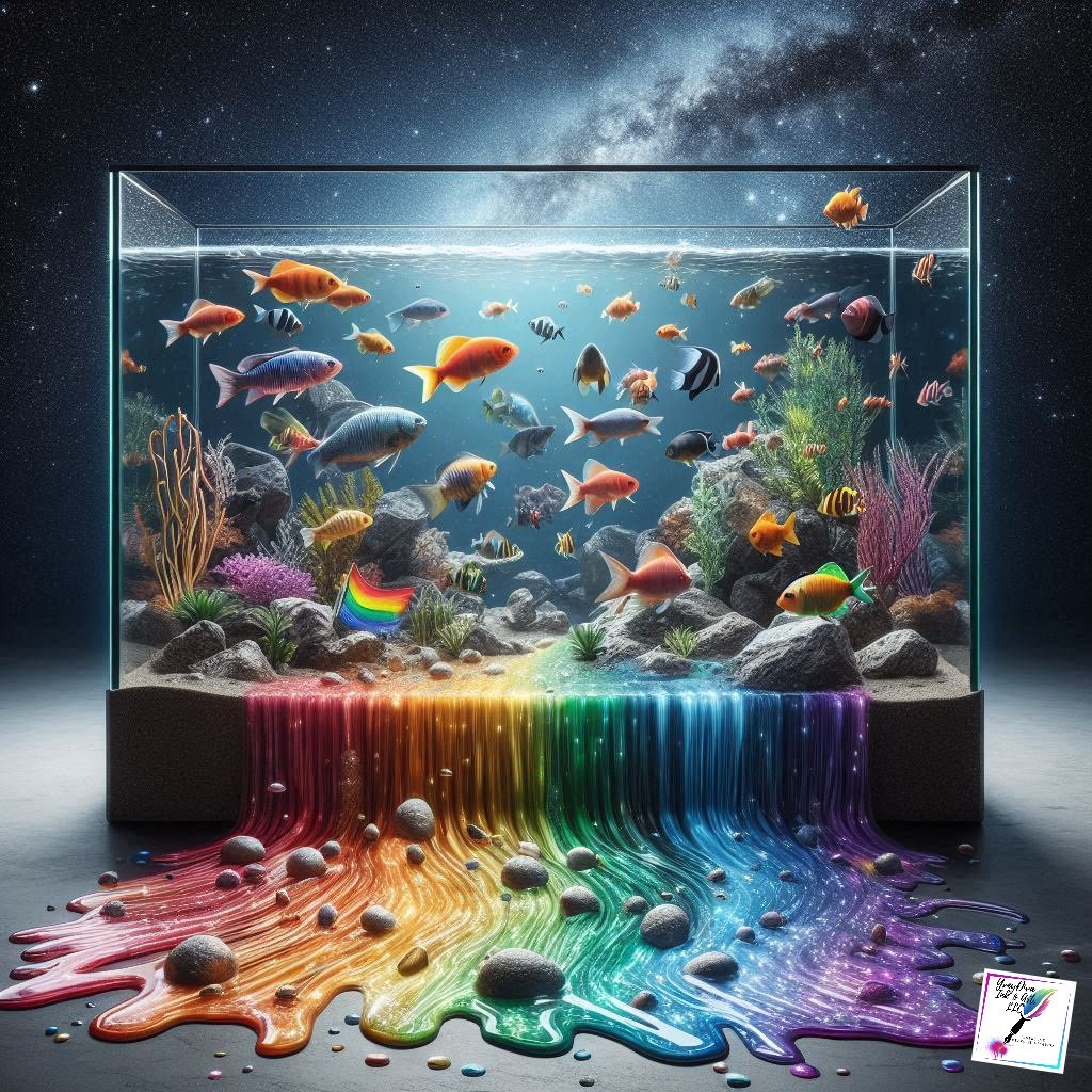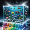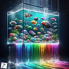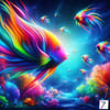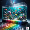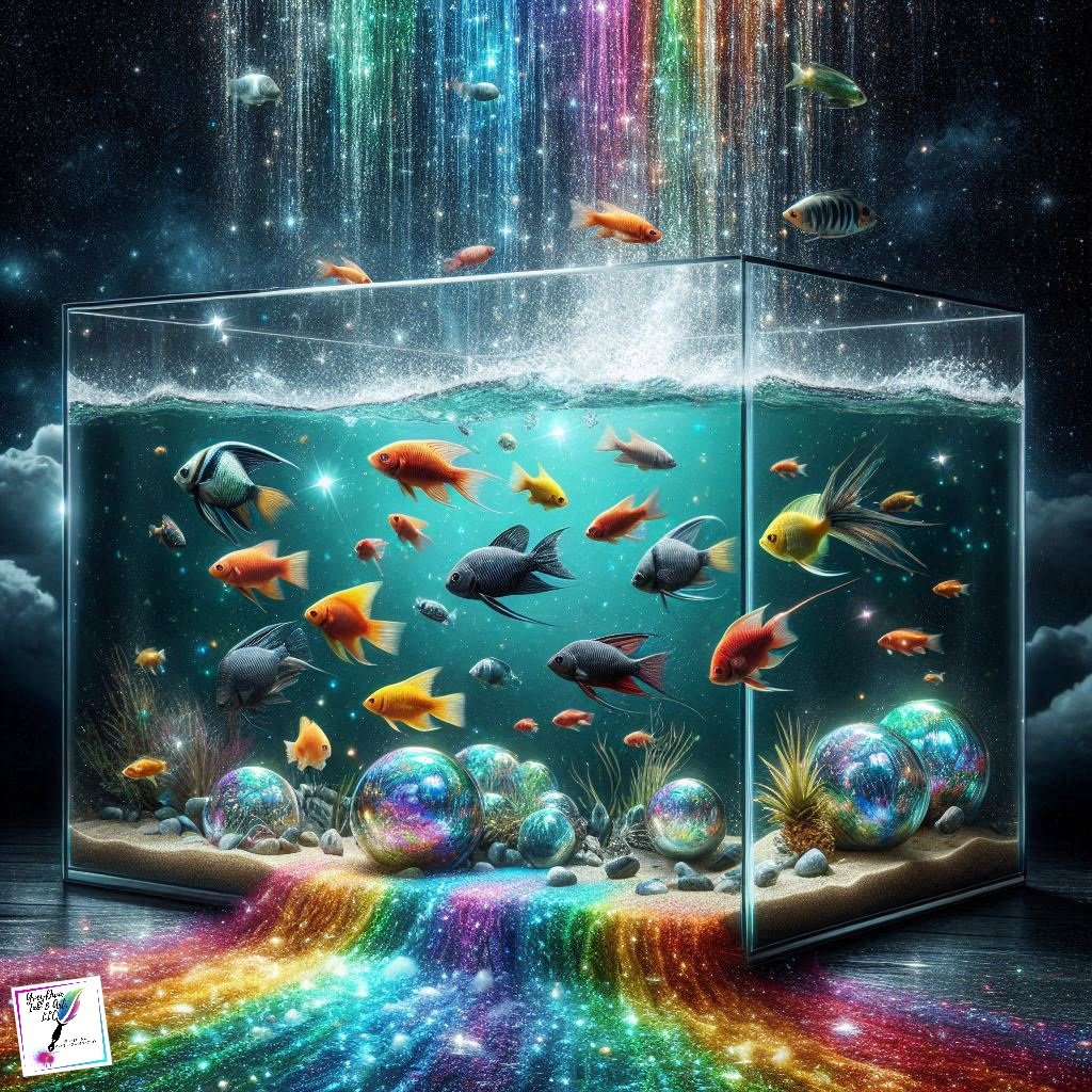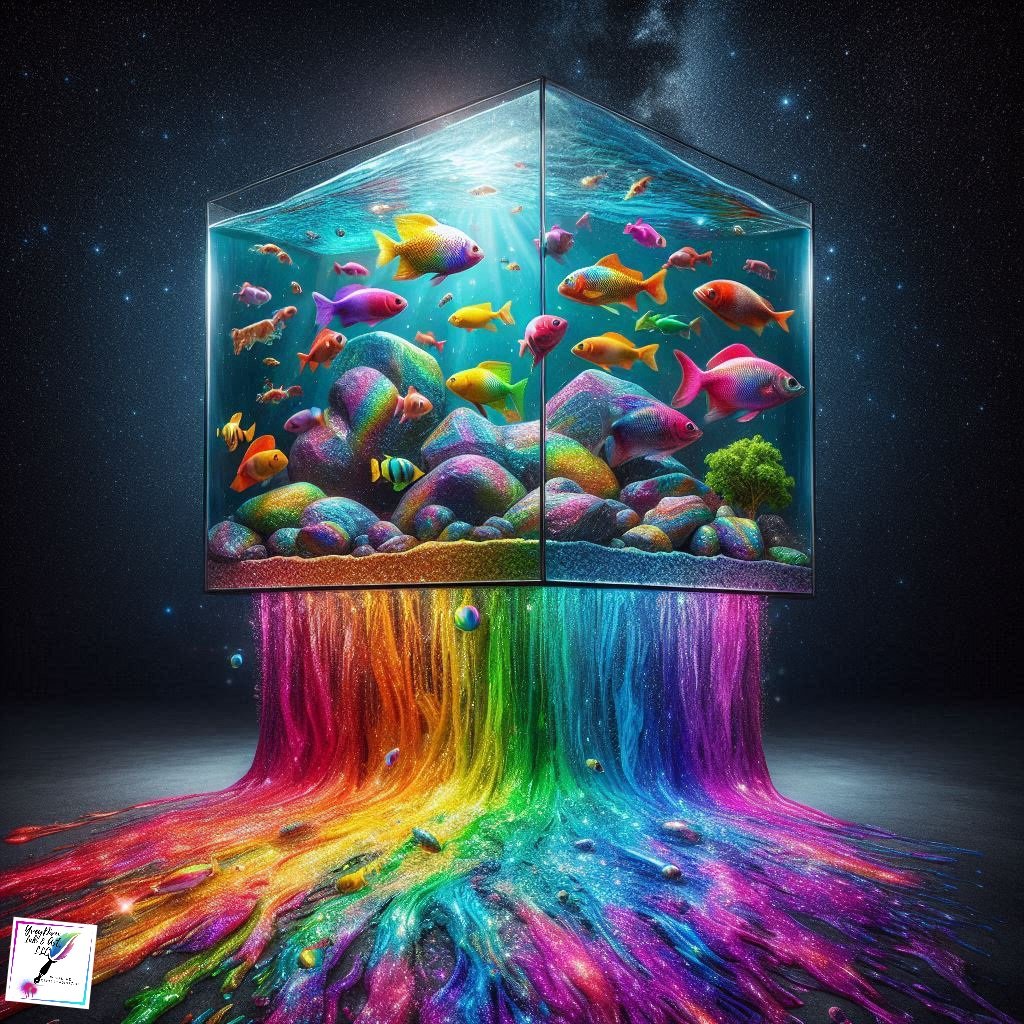 Cascade of Rainbow Fish captures a moment of vibrant overflow, where a giant glass fish tank can no longer contain the spectrum within. Multicolored fish spill outward in a flowing descent, each one revealing its own brilliant hues, creating a living waterfall of color, motion, and life.