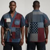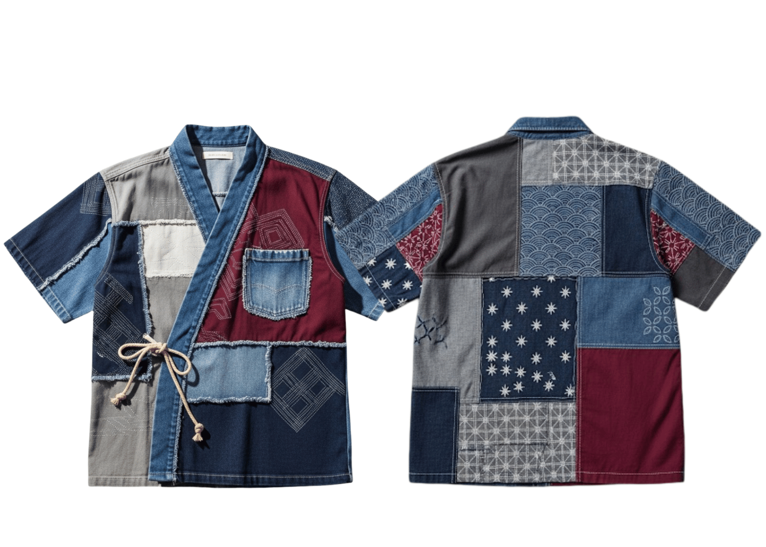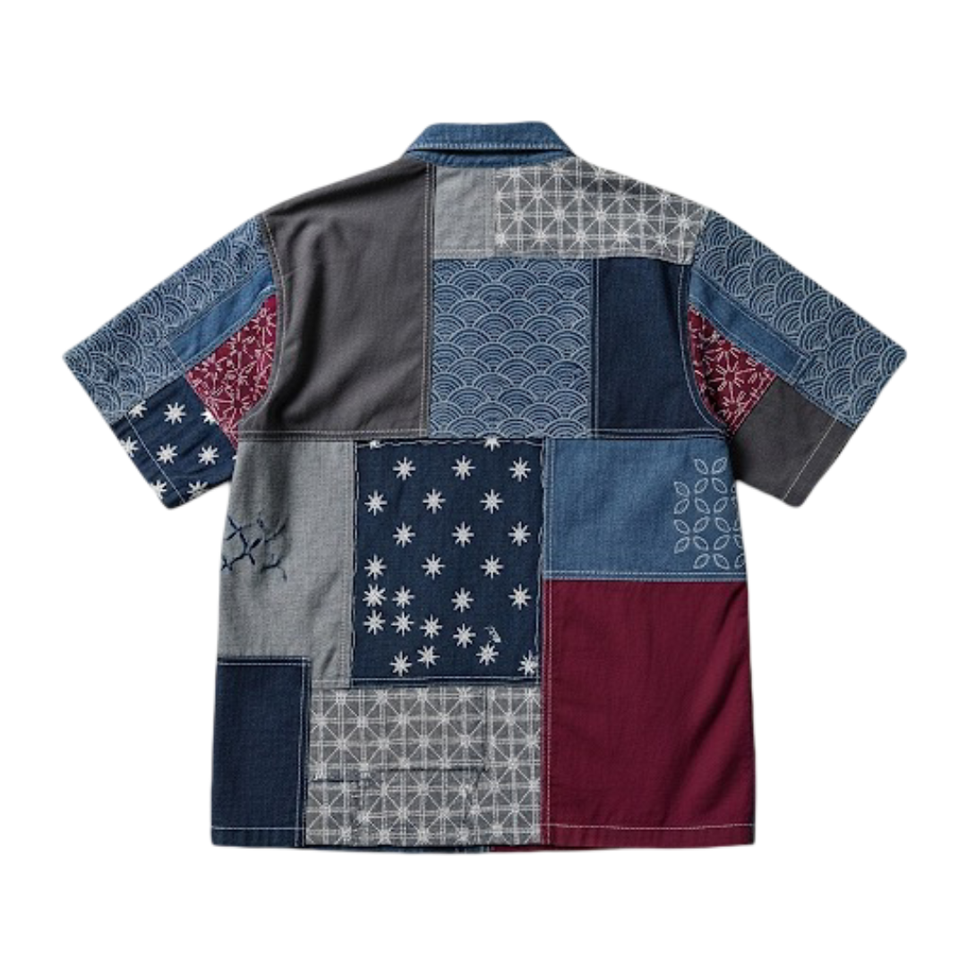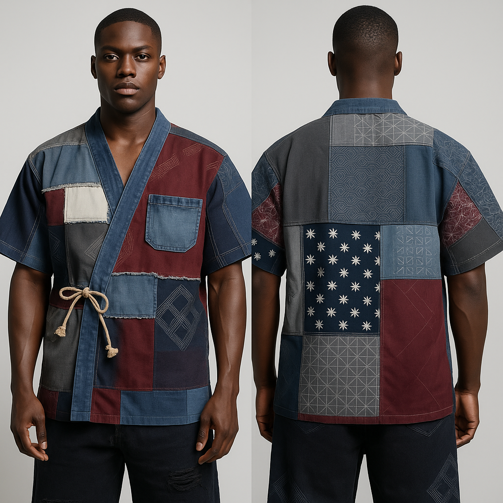 This patchwork kimono-style shirt is a bold fusion of traditional Japanese silhouette and modern streetwear flair. Designed with an eye-catching mix of recycled denim, cotton twill, and canvas panels, it showcases raw-edge stitching, sashiko-inspired embroidery, and a natural cotton rope tie closure. Lightweight and breathable, this piece is perfect for layering or standalone styling.