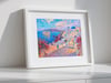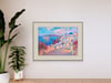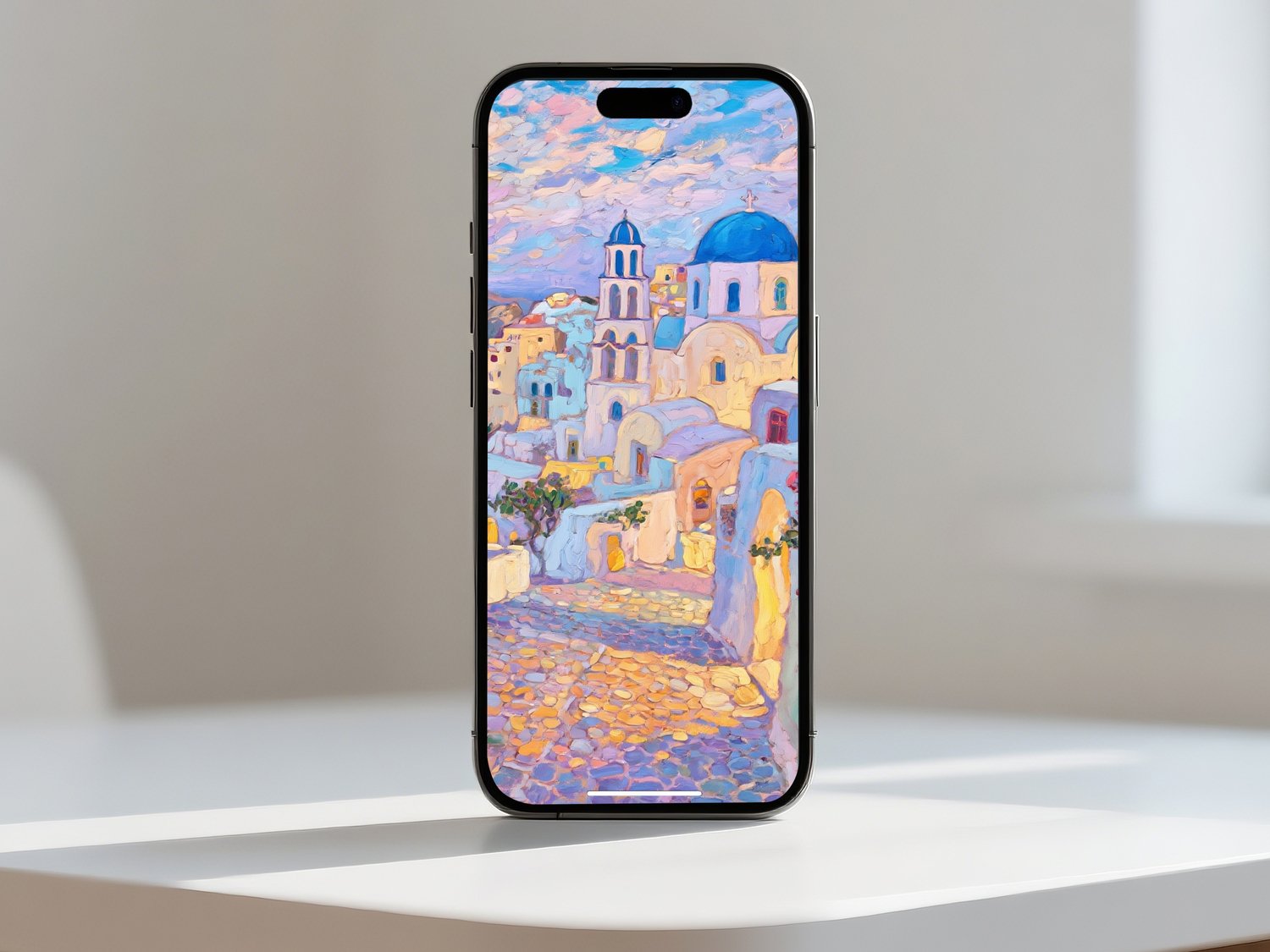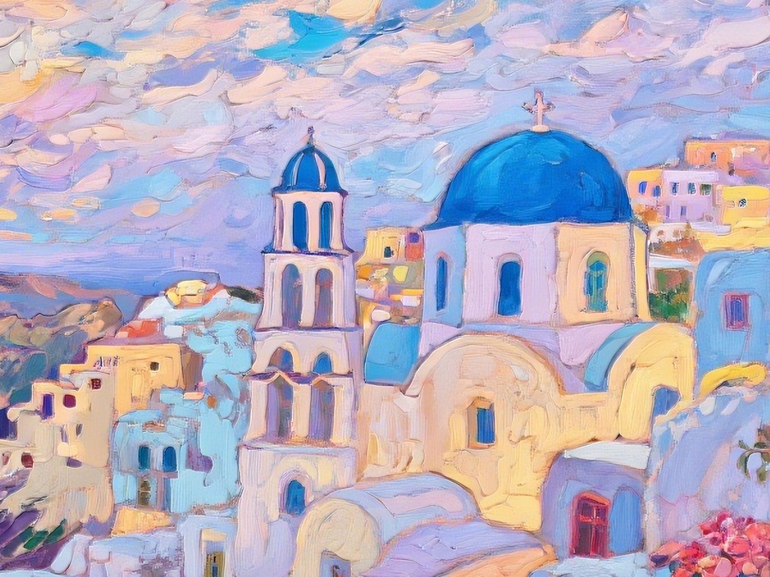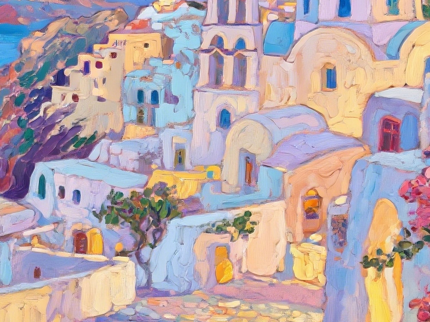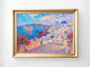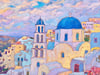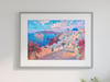 This colorful Santorini artwork features powerful Feng Shui symbols: