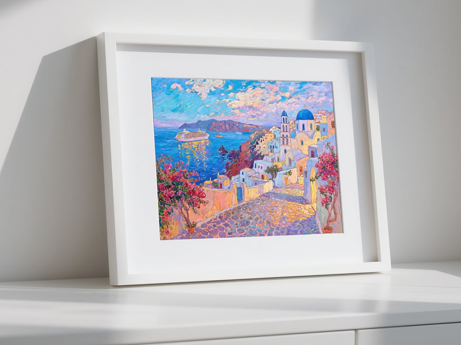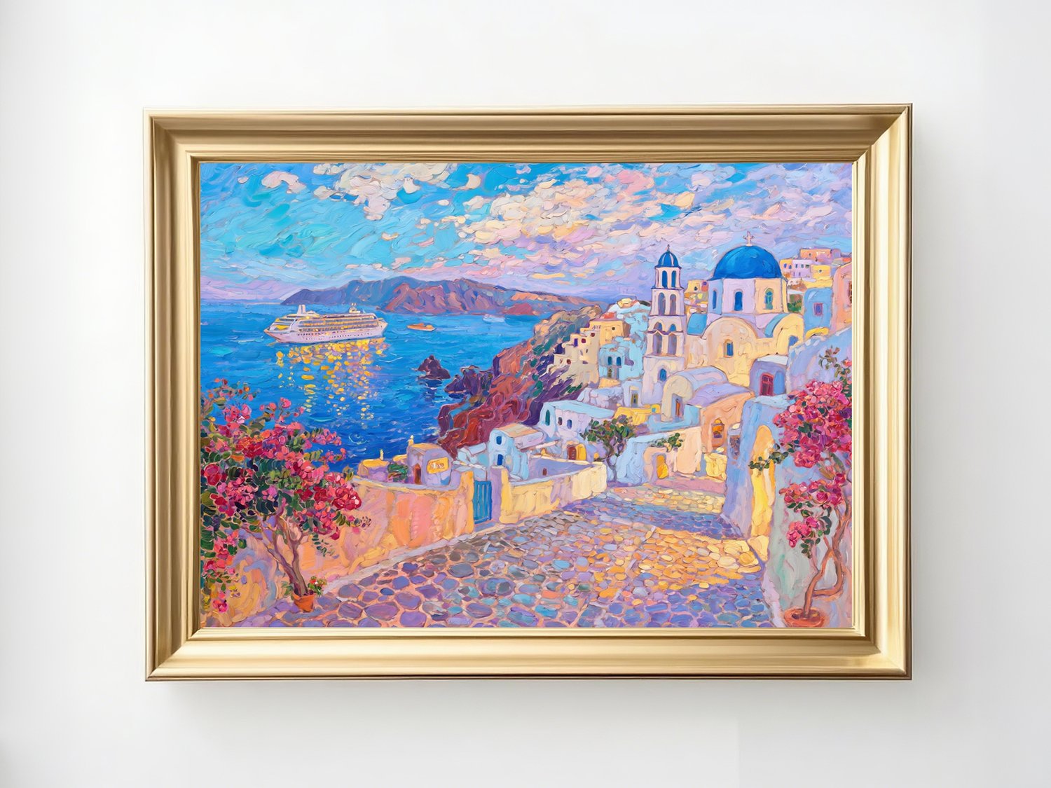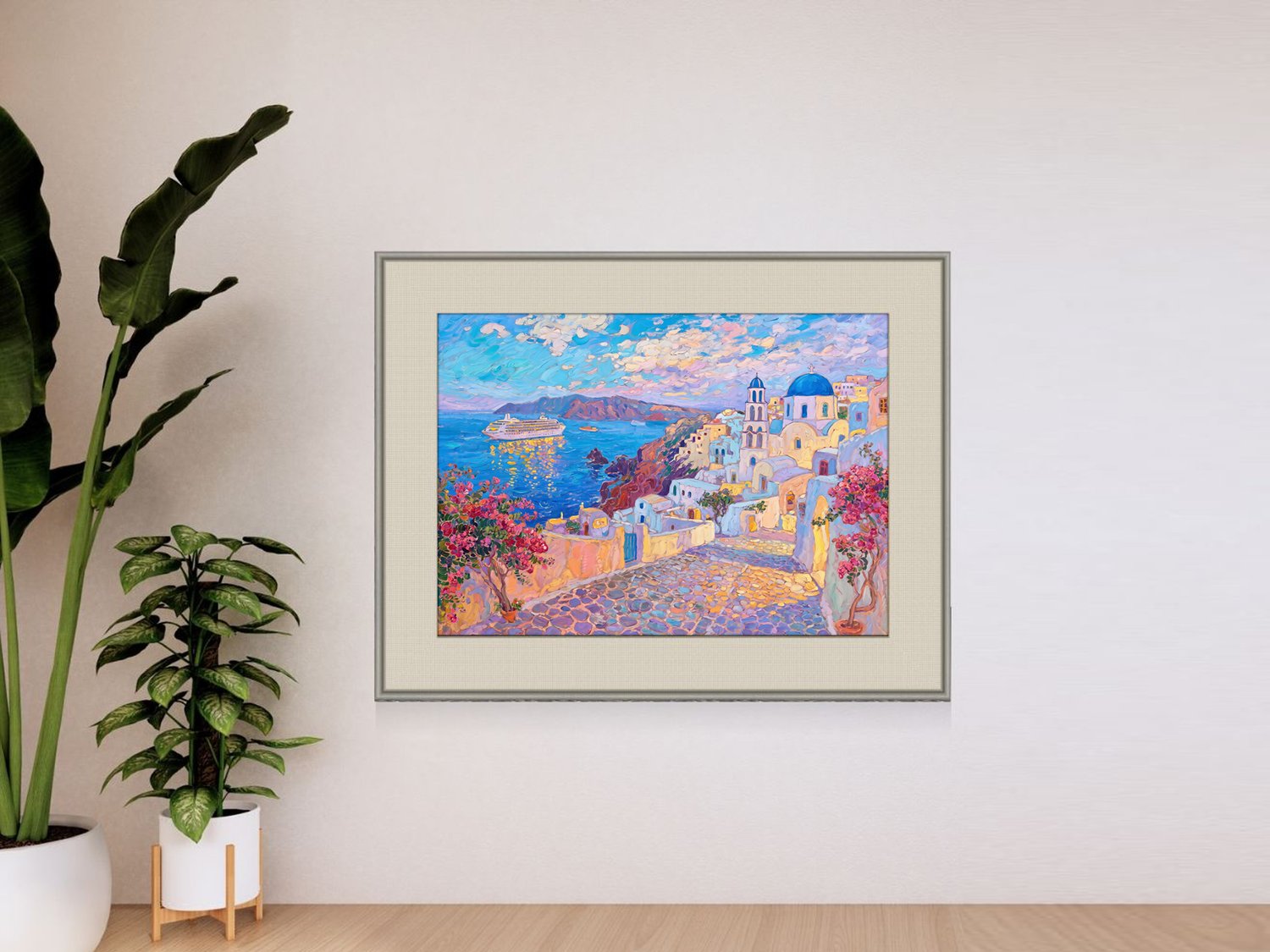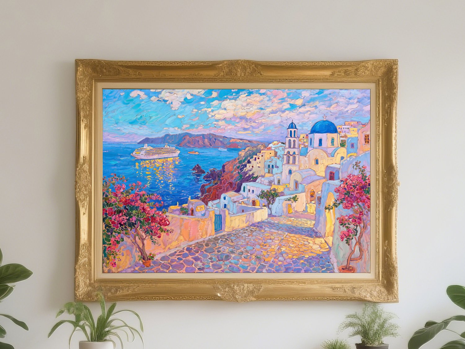A vibrant digital painting of Santorini with a luminous cruise ship gliding across the shimmering sea. This Feng Shui art symbolizes wealth, opportunity, and forward motion. It’s ideal for entryways, offices, or any space where you wish to attract success, renewal, and positive energy.