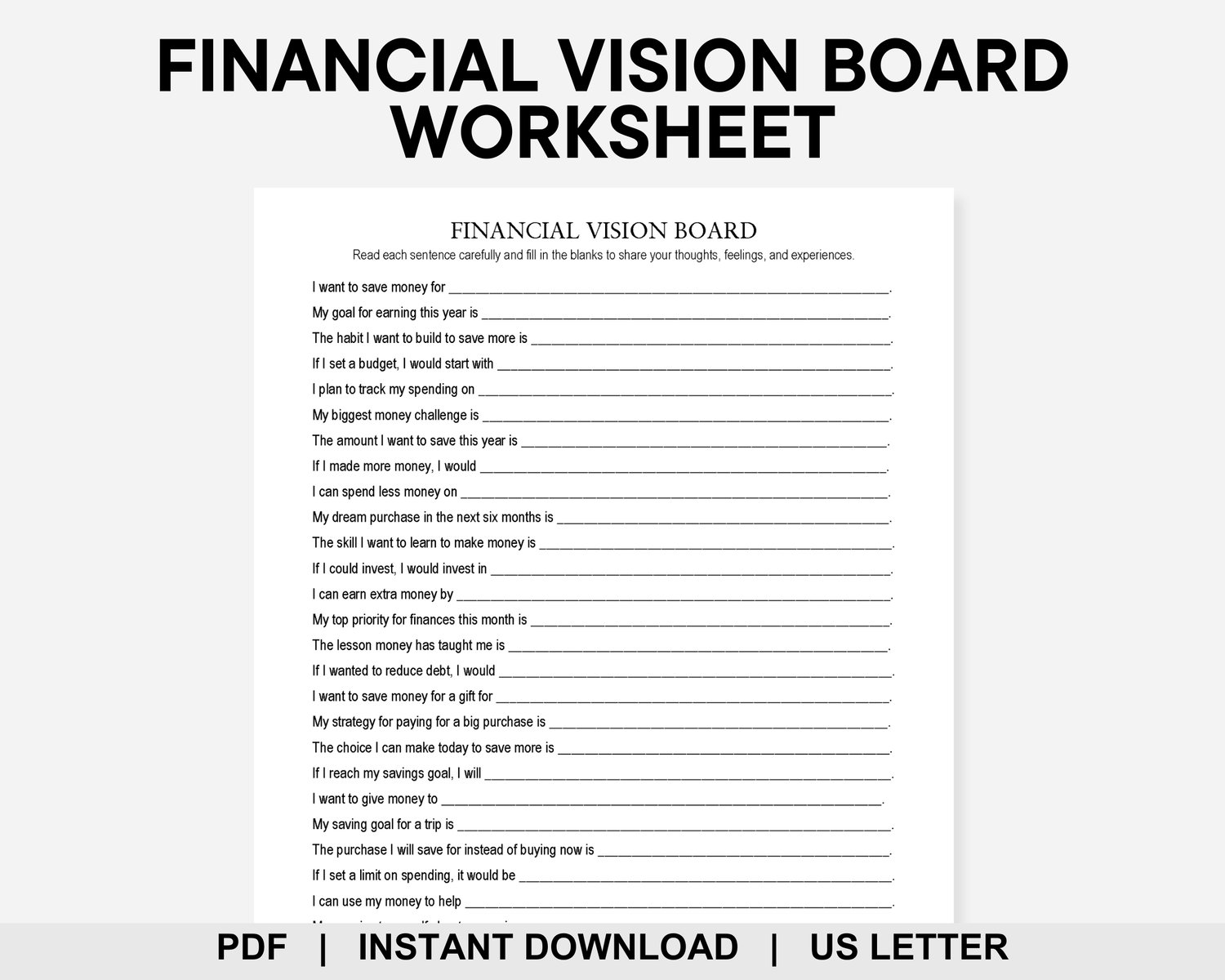 Visualize the life you want and then build the budget that supports it. This Financial Vision Board worksheet features 30 prompts to help you bridge the gap between wishing for change and making it happen. Use it for therapy sessions, journaling, or self-reflection to connect your daily spending to the life you want to lead. Dare to dream big and plan even bigger.