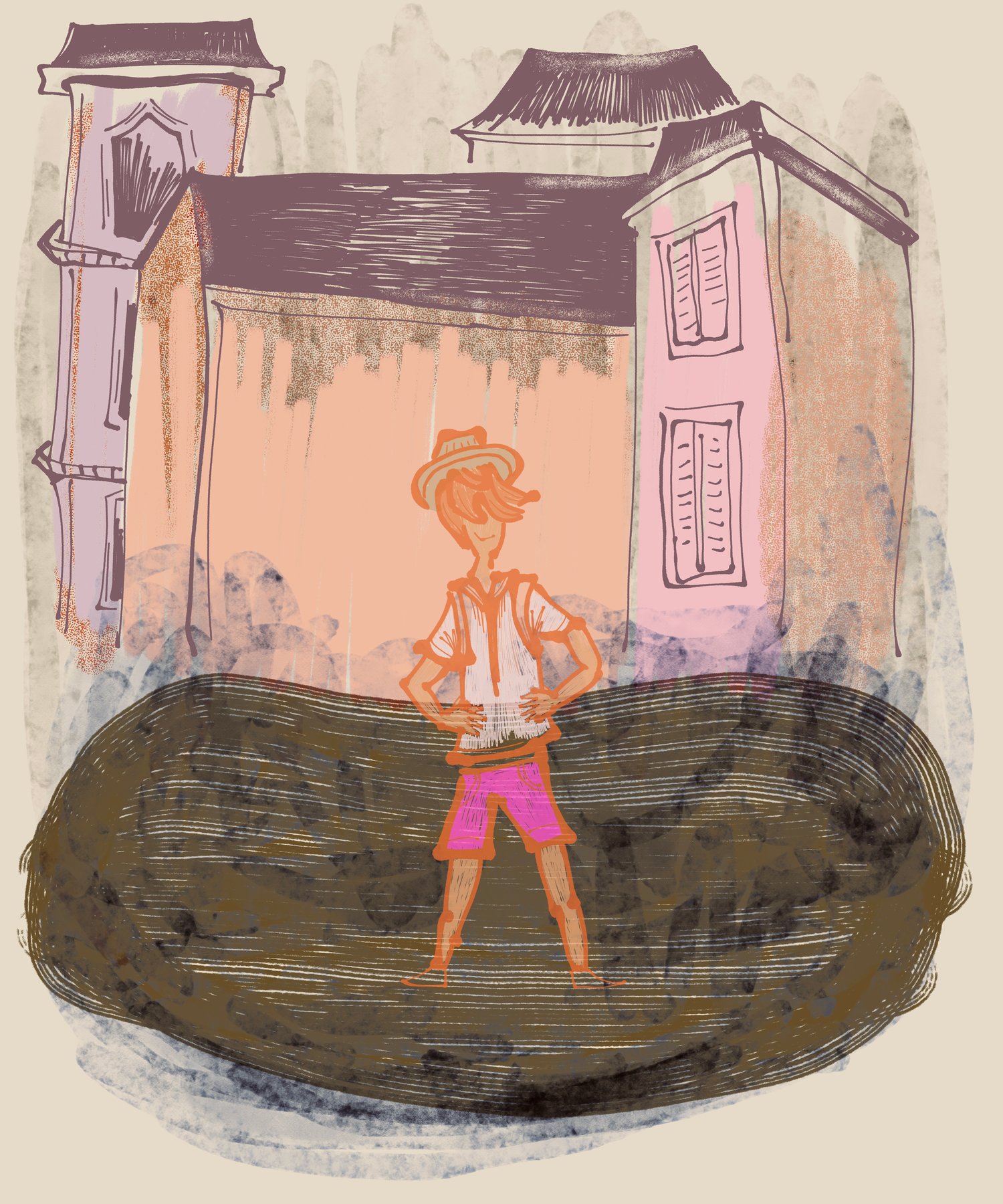 This is an illustration with comics painterly style about a character who is out and about looks like they might be tourists enjoying some urban or town discovering new things.