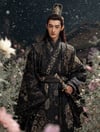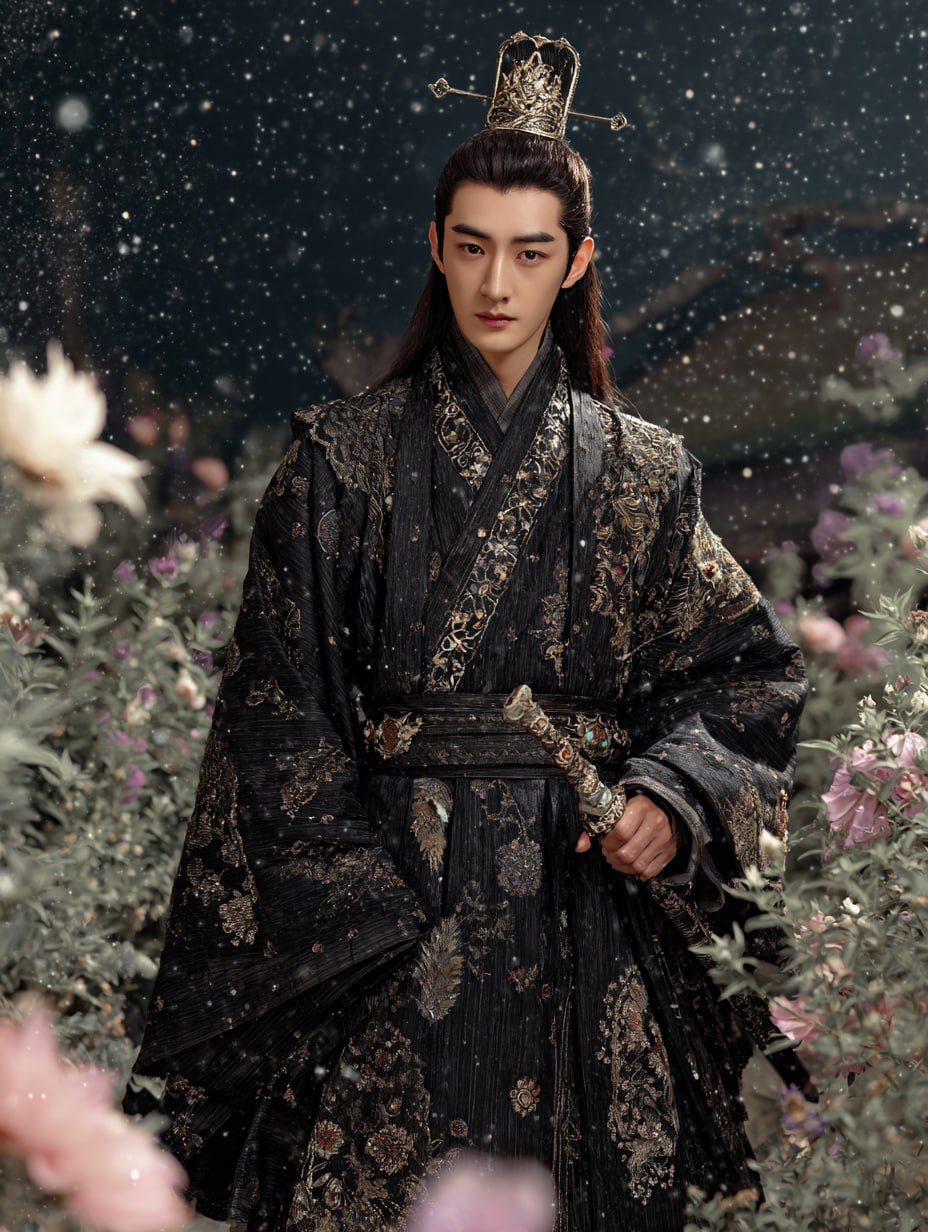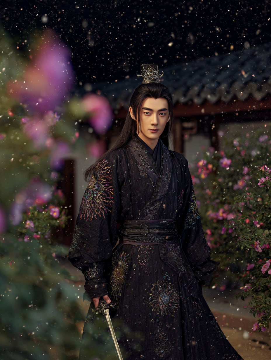 Create breathtaking, cinematic character visuals with this premium AI prompt designed for MidJourney. Generate a striking full-body portrait of a handsome man in elegant black hanfu, adorned with intricate embroidery of clouds and stars, set within a serene night courtyard. Every detail—from refined facial features to atmospheric lighting—is crafted to deliver high-end, professional results. This product is a ready-to-use AI prompt, not a finished image, allowing you to generate your own unique, stunning visuals instantly.