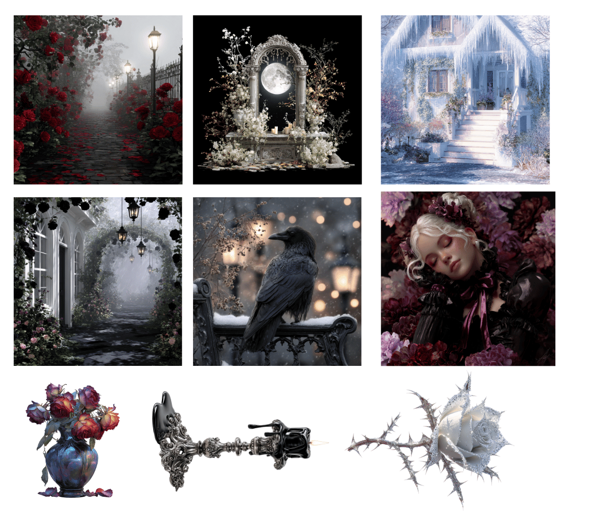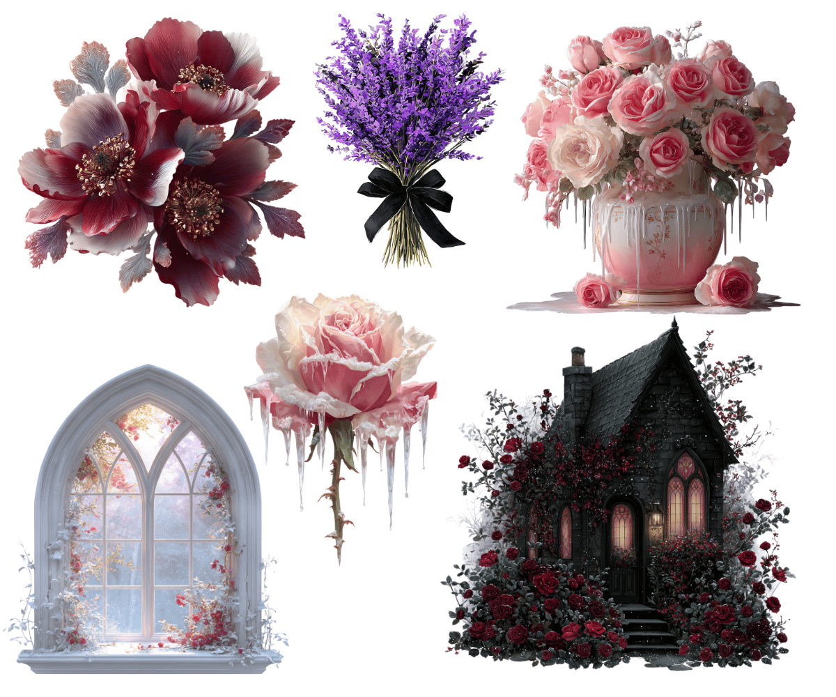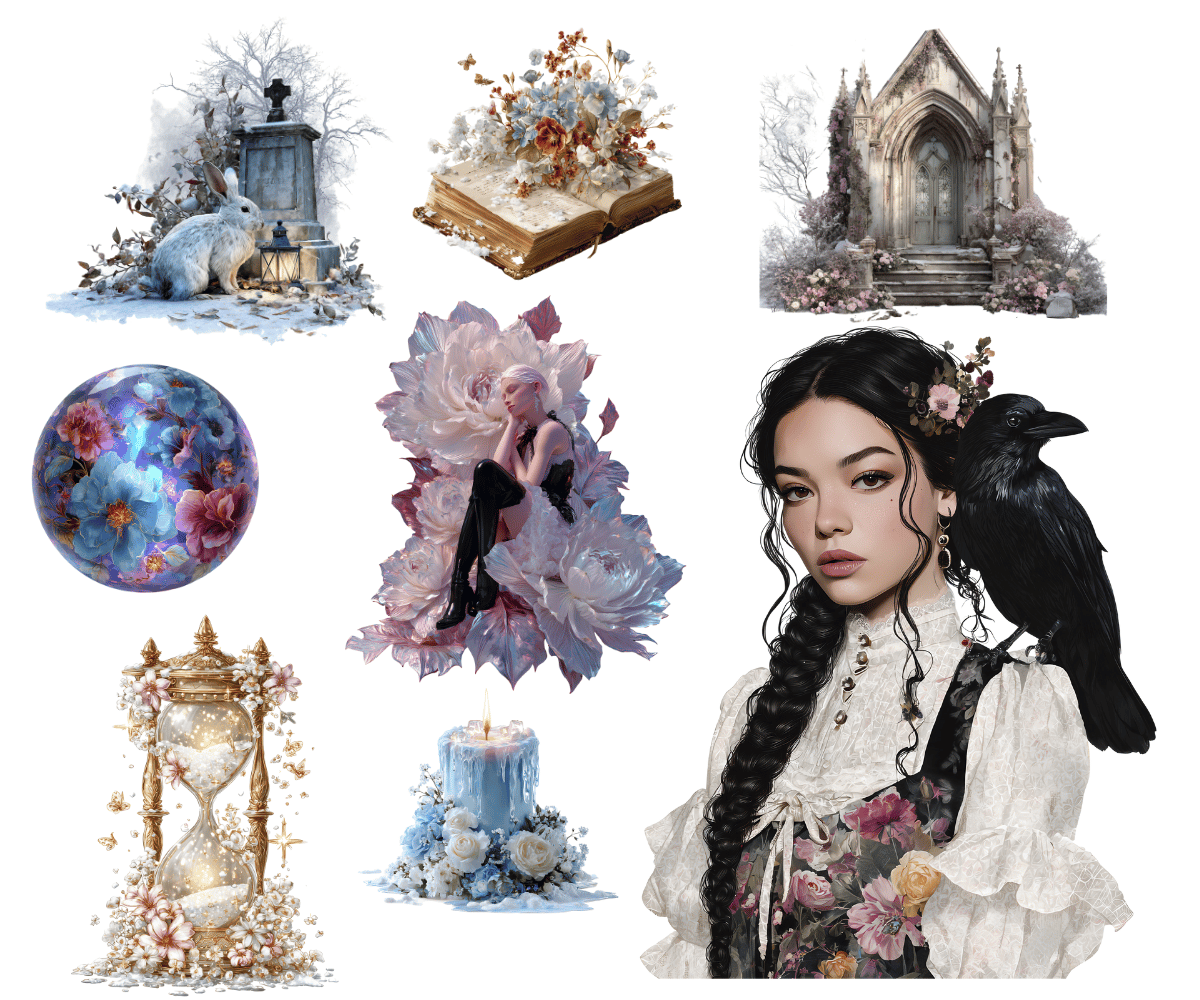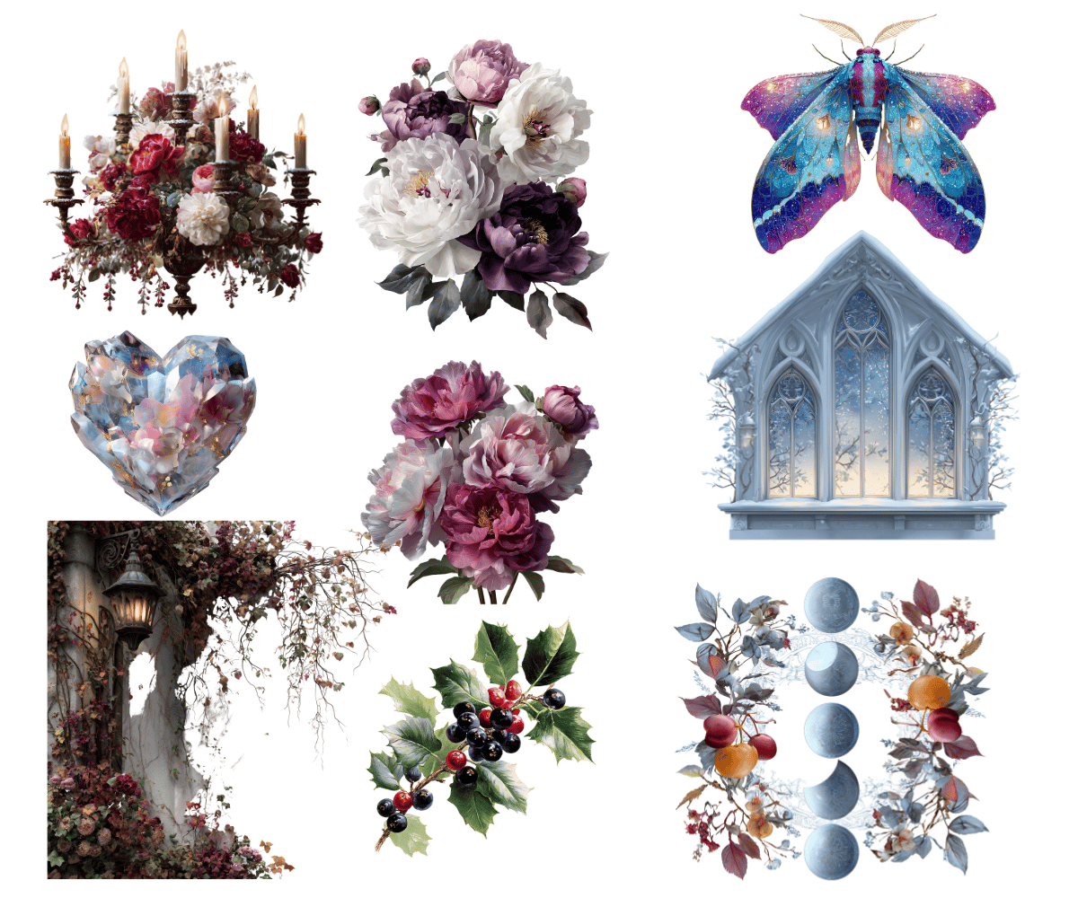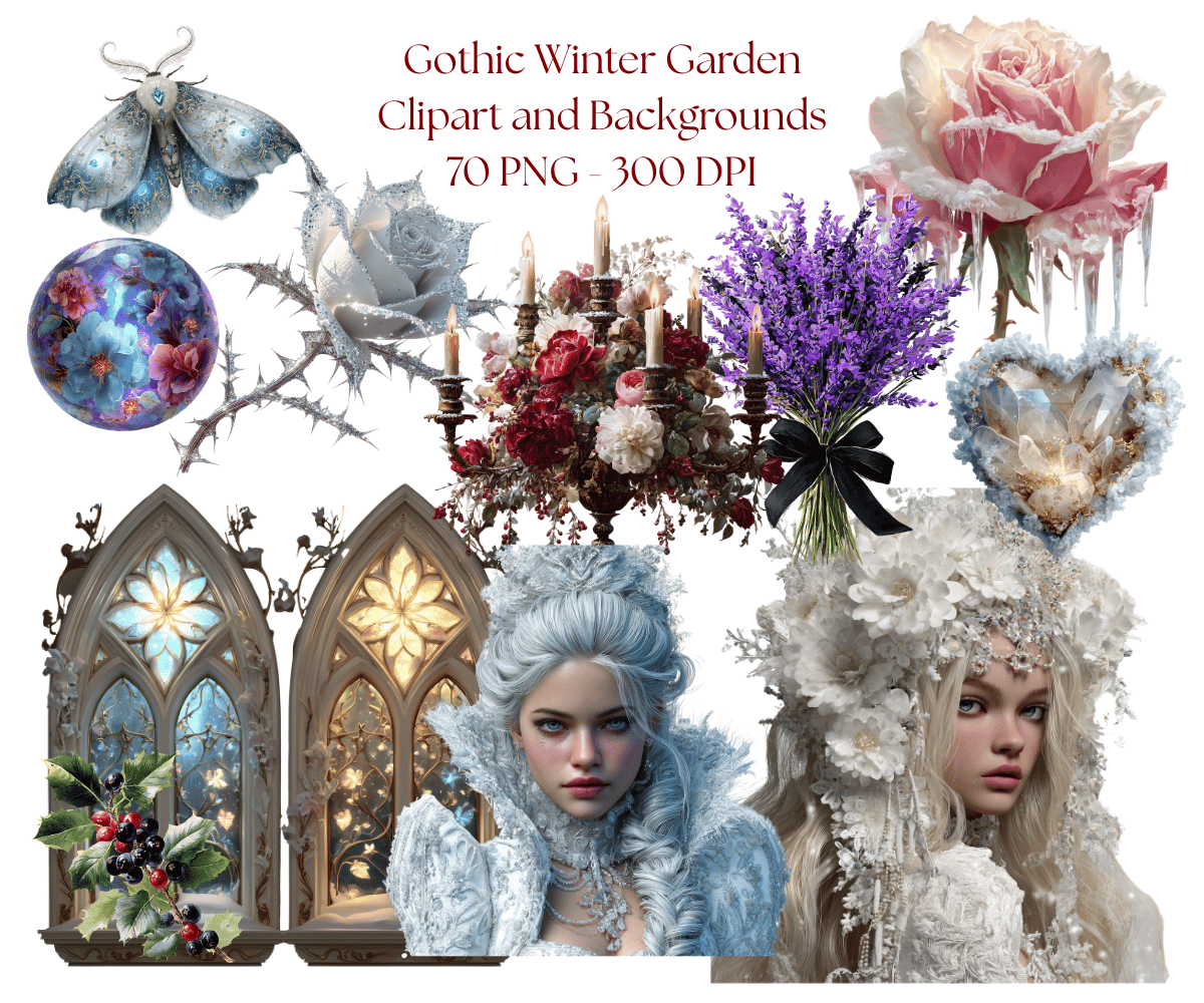 Elevate your crafting projects with our Gothic Winter Garden Clipart and Backgrounds bundle. Perfect for instant download and sublimation design backgrounds. Backgrounds include elegantly styled papers suitable for crafting projects in gorgeous rich tones evocative of the holiday aesthetic. Ideal for digital art, printable clipart, and crafting, this set is a must-have for creating charming arts and crafts designs. In fact, cut them out and place them on your planners to make for an extra special gift for an organizer.