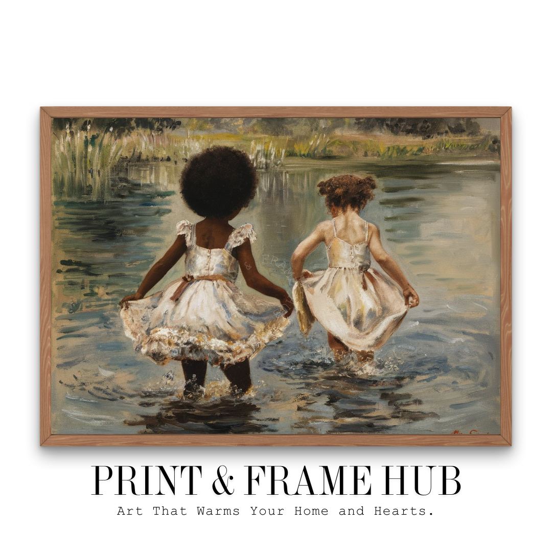 This enchanting painting captures the innocent delight of two young girls wading in a serene pond. Dressed in delicate white dresses, they hold up their skirts as they splash through the water, their reflections shimmering below. The vibrant depiction of their carefree play and the natural beauty surrounding them evokes a sense of nostalgia and pure joy. This artwork is the perfect addition to your wall, infusing your space with warmth and a touch of childhood wonder.