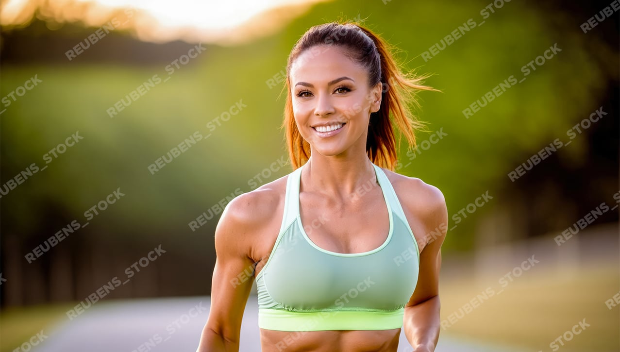 Happy Woman in Workout Clothes Running on a Road in a Scenic Park. Fitness and Active Lifestyle Concept