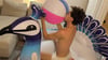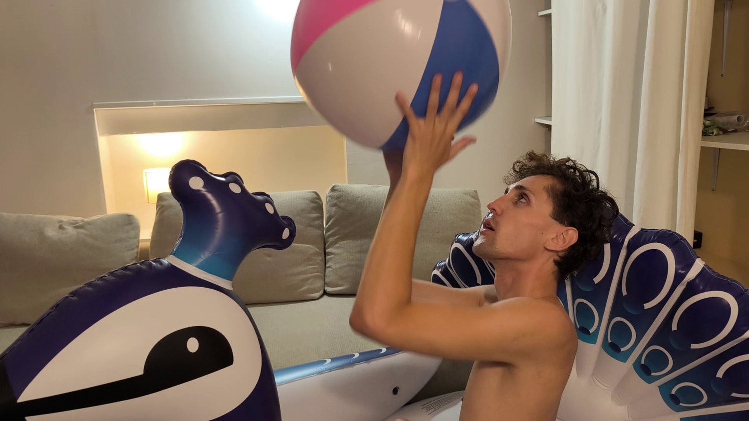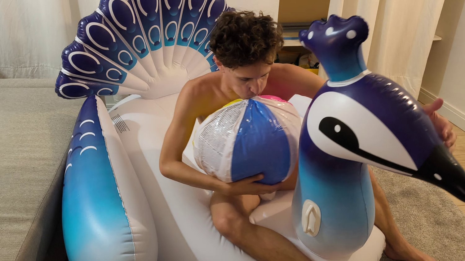 Laying on a nice inflatable peacock Ken blow one intex 24" beach balloon.