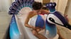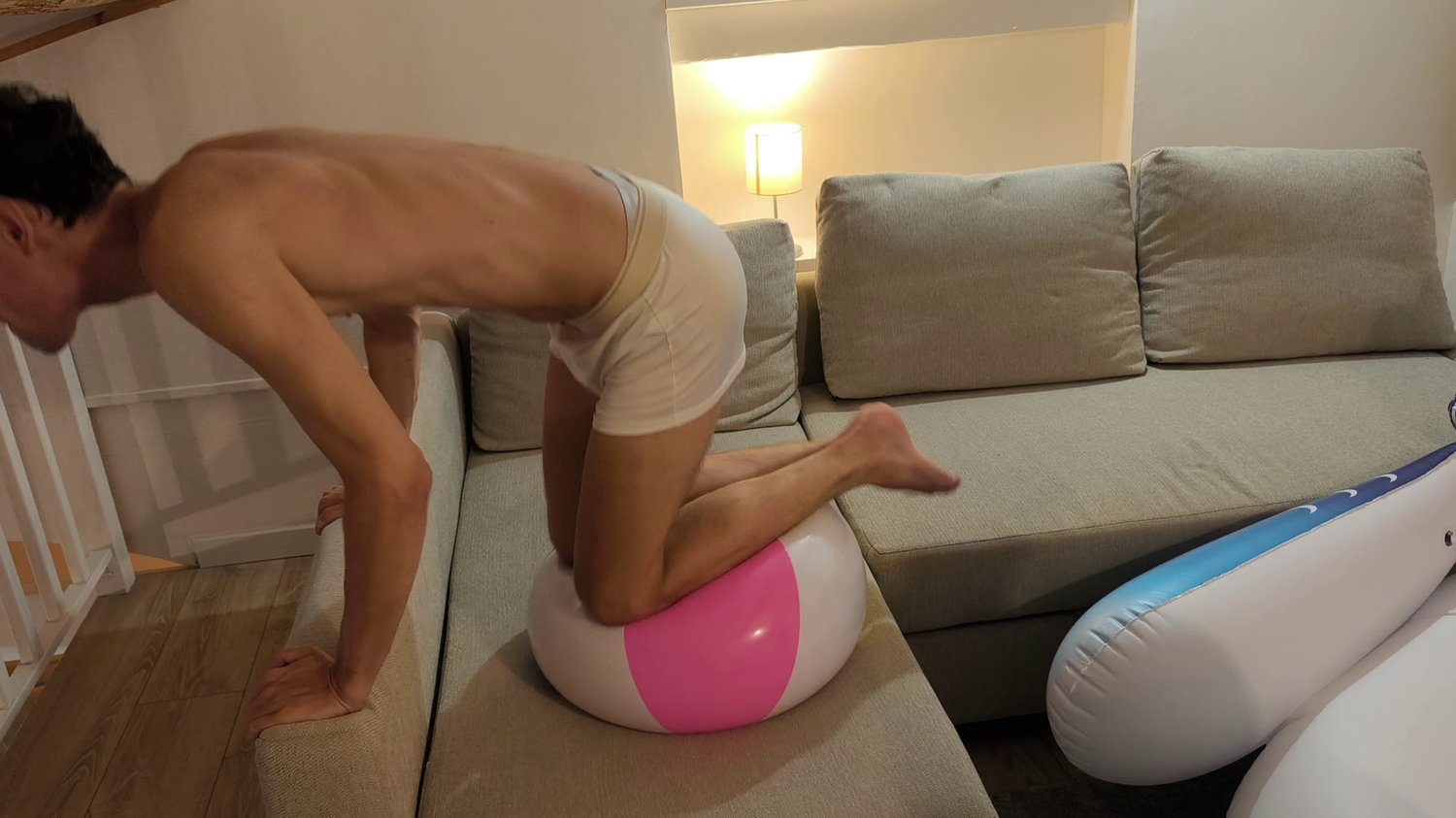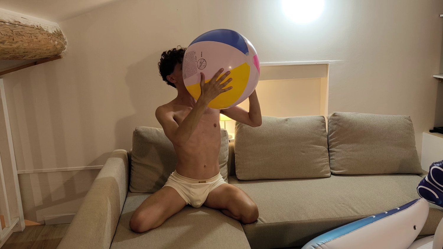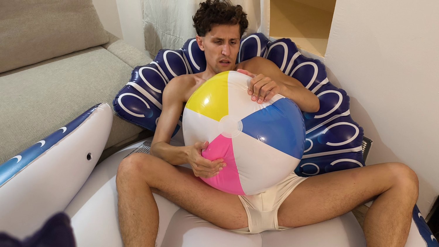 He asks me if I thin he can pop it. So he try to jump on it, sit on it, stomp it