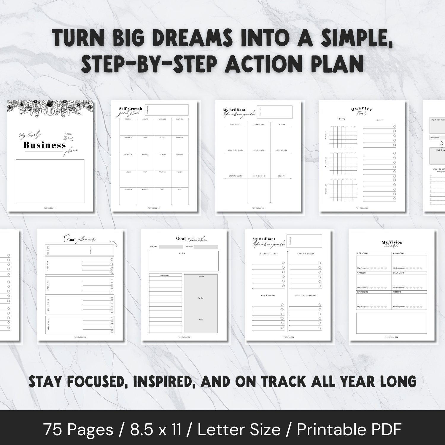- Yearly, monthly & weekly structure: Move effortlessly from big-picture vision to bite-sized action steps with timelines, calendars, and habit trackers.